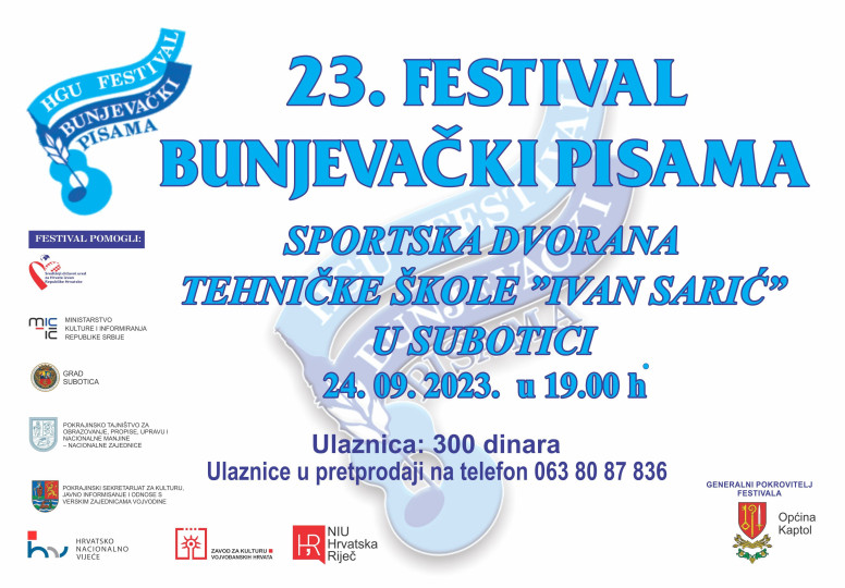 Festival bunjevački pisama, 23. po redu, bit će održan u nedjelju, 24. rujna 2023. godine u Subotici, u Sportskoj dvorani Tehničke škole Ivan Sarić, s početkom u 19 sati.