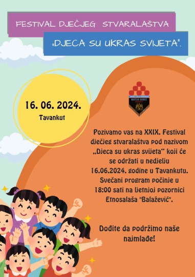 HKPD Matija Gubec iz Tavankuta organizira XXIX. Festival dječjeg stvaralaštva pod nazivom Djeca su ukras svijeta koji će se održati u nedjelju 16. lipnja (juna) 2024. godine u Tavankutu.