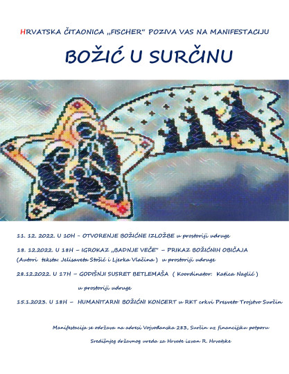 Hrvatska čitaonica Fischer u okviru programa Božić u Surčinu organizira Humanitarni božićni koncert u nedjelju, 15. siječnja 2023. godine u župnoj crkvi Presvetog Trojstva u Surčinu, s početkom u 18 sati.