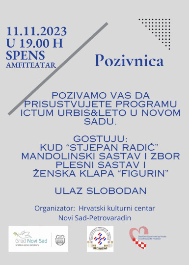 Hrvatski kulturni centar Novi Sad organizira kulturni program pod nazivom Ictum urbis & Leto u Novom Sadu 11. studenoga 2023. godine u Amfiteatru SPENS-a s početkom u 19 sati. Ulaz je slobodan.