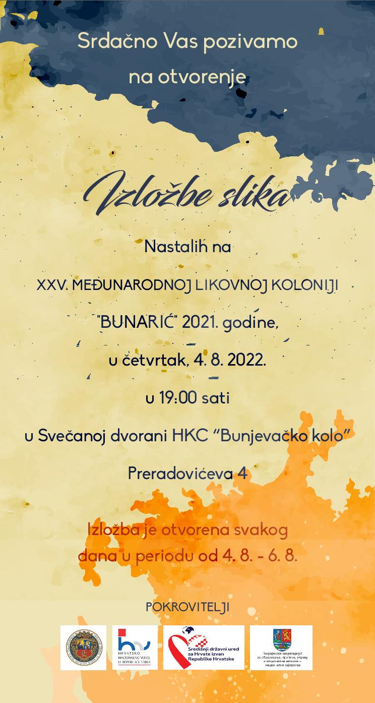 Otvorenje izložbe slika nastalih na XXV. Međunarodnoj likovnoj koloniji Bunarić 2021. će biti u četvrtak, 4. kolovoza u svečanoj dvorani HKC-a Bunjevačko kolo, u 19 sati.
