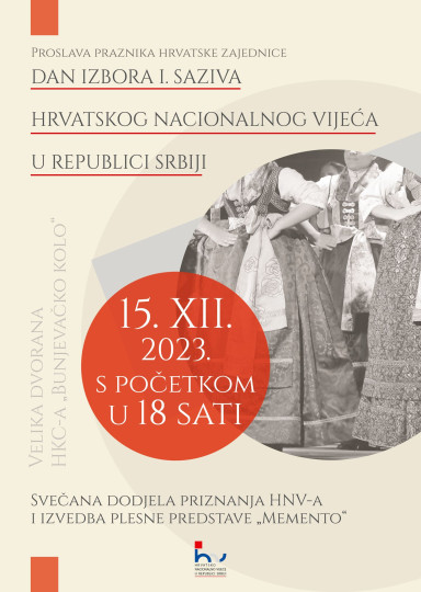 Praznik hrvatske zajednice – Dan izbora prvog saziva Hrvatskog nacionalnog vijeća u Republici Srbiji – bit će obilježen svečanom akademijom u petak, 15. prosinca 2023. godine s početkom u 18 sati u Velikoj dvorani HKC-a Bunjevačko kolo u Subotici.
