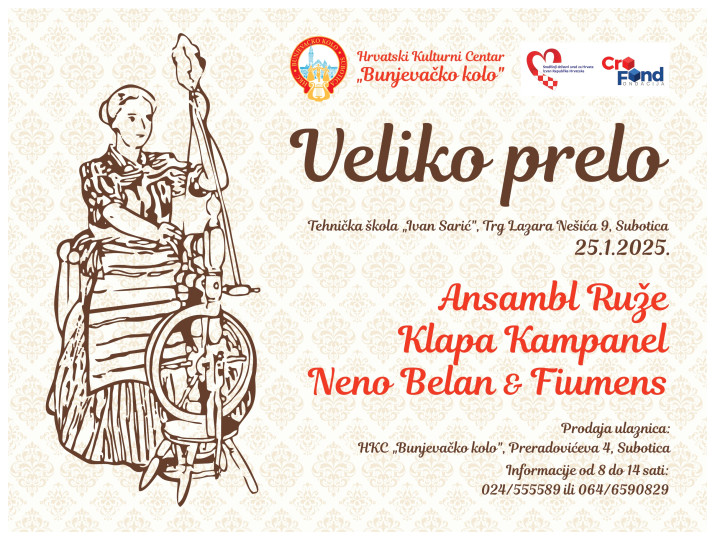 Hrvatski kulturni centar Bunjevačko kolo priređuje Veliko prelo 2025. u subotu, 25. siječnja 2025. godine, u sportskoj dvorani Tehničke škole Ivan Sarić u Subotici. Okupljanje gostiju je od 19 do 20 sati. Zvanični program će započeti u 20 sati.
