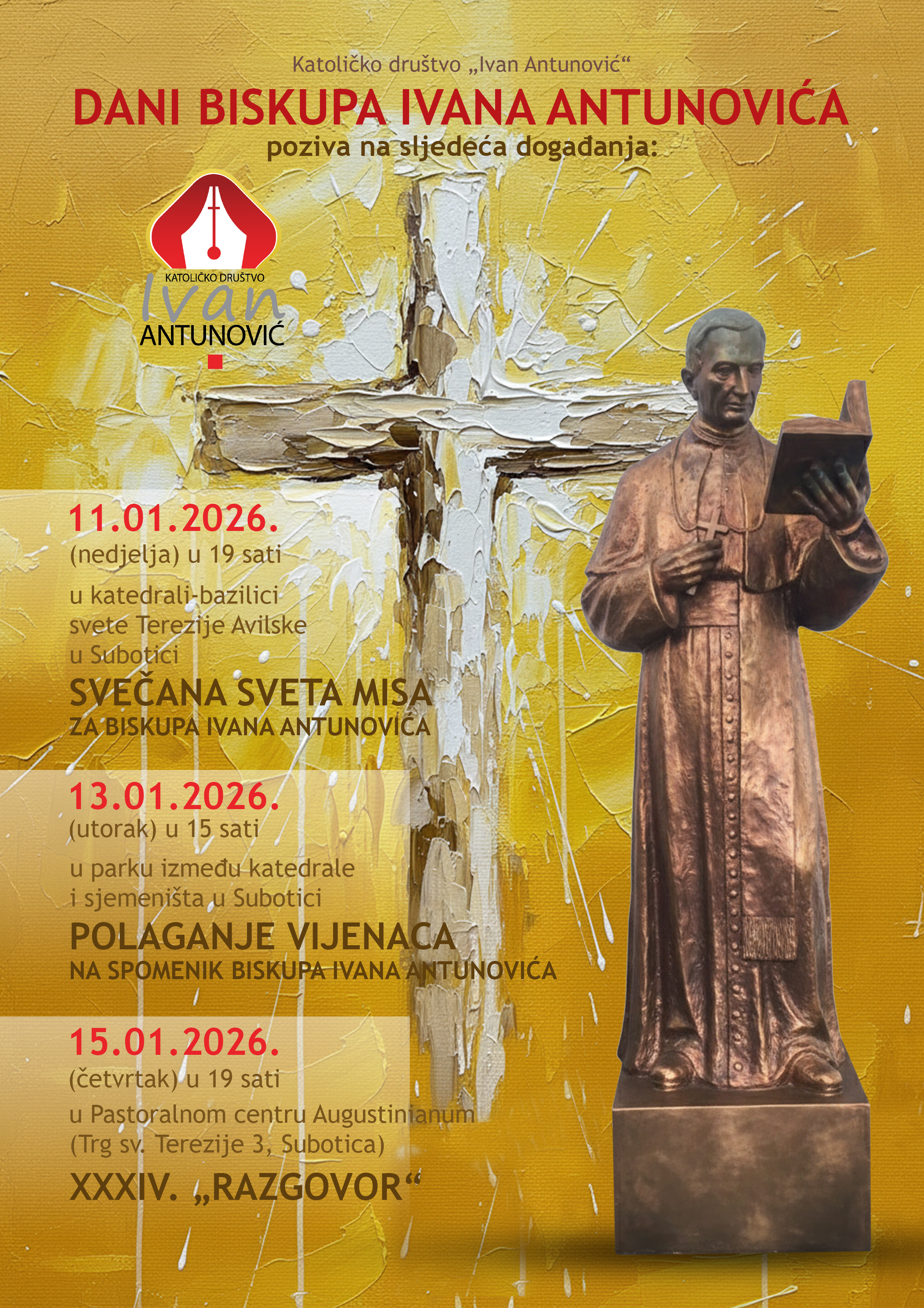 Katoličko društvo Ivan Antunović u okviru manifestacije Dani biskupa Ivana Antunovića priređuje XXXIV. Razgovor u Pastoralnom centru Augustinianum (Trg sv. Terezije 3, Subotica) 15.01.2026. s početkom u 19 sati.