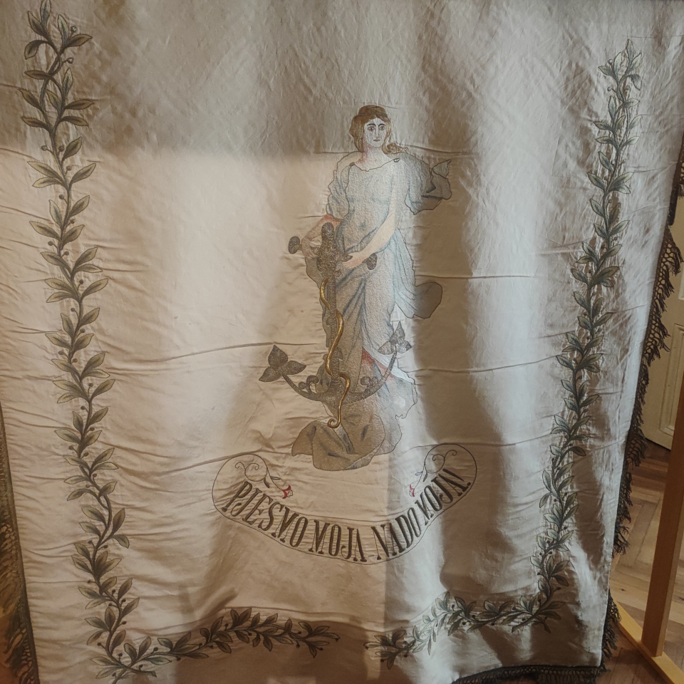„Predmeti su originalni i većina ih je donesena iz Muzeja Srema, a u realizaciji izložbe pomogli su Muzej Vojvodine, Muzička škola Petar Krančević iz Srijemske Mitrovice, HKC Srijem – Hrvatski dom, dok je veliki broj predmeta iz privatnog vlasništva. Fotografije su vrlo značajan materijal, povijesni pisani trag o aktivnostima pjevačkih društava, zatim tu su značke, medalje, slika Petra Krančevića, haljine iz XX. stoljeća i po mom mišljenju, jedni od najljepših predmeta su zastave Hrvatskog pjevačkog društva Nada i Hrvatskog pjevačkog društva Hrvatska omladina. Zastave su posuđene iz HKC-a Srijem. Izrađene su od svile i ukrašene zlatovezom, a ono što je interesantno je da na vrhu imaju utisnute zlatne pločice na kojima su urezana imena svih darovatelja. Zlatne pločice poslužile su za prevladavanje financijske krize pjevačkog društva“, kazala je Trivunović.