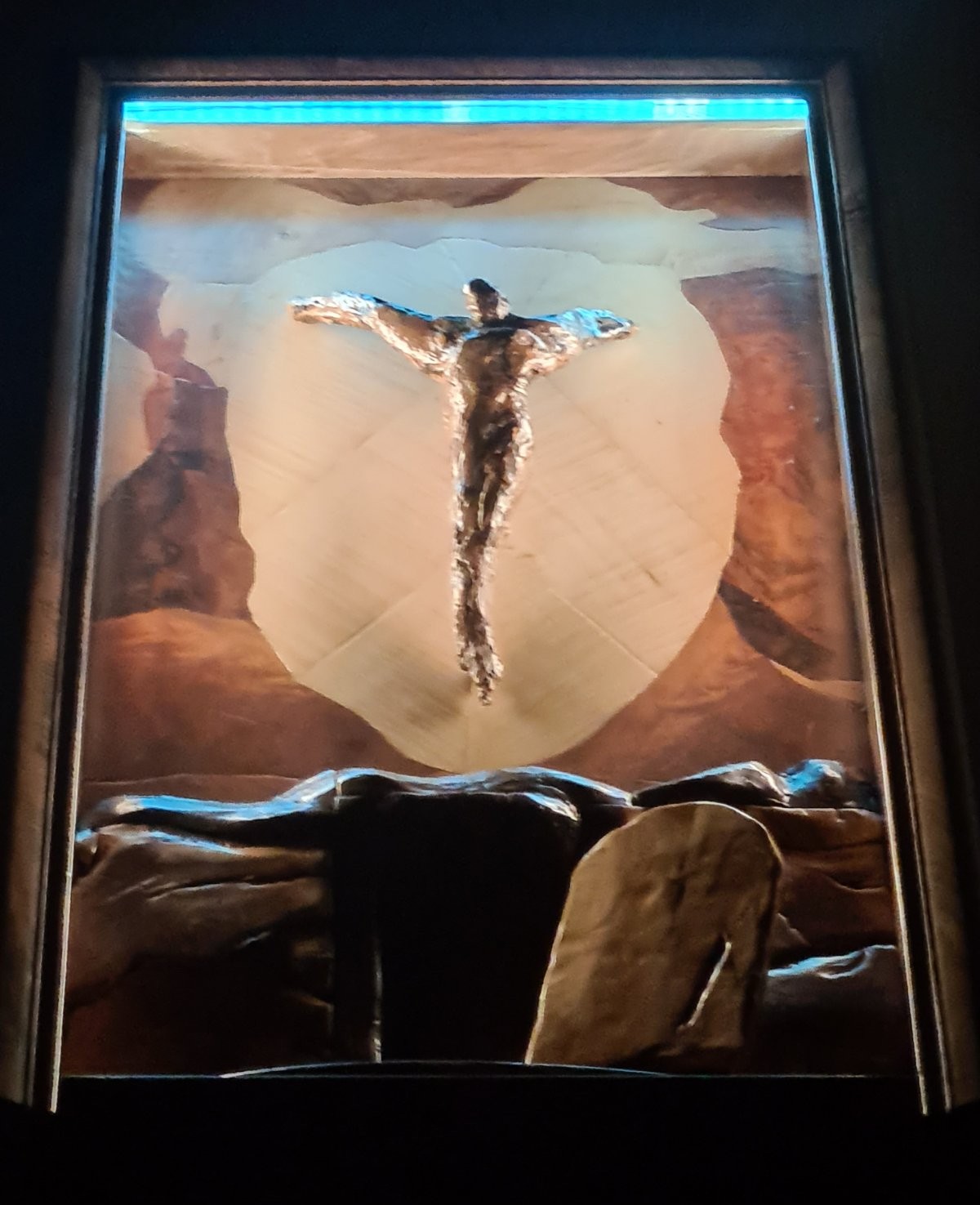 Dodaje kako je zamisao vrlo brzo dobila i dublji smisao, jer dolazi iz župe Uskrsnuća Isusovog, gdje se na oltarnoj slici nalazi gotovo isti prikaz Krista s uzdignutim rukama. Upravo ga je ta sličnost potaknula da od komada drveta pokuša oblikovati, kako kaže, jednu nijemu priču.