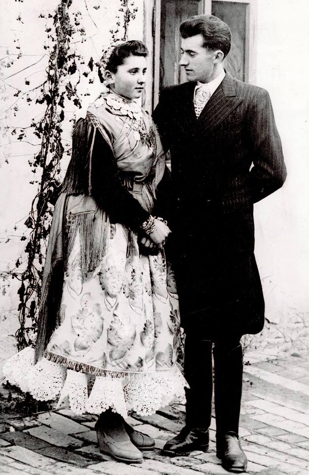 Slika 11. Ivica Filipović, u bričes pantalonama, čizmama, dereklijanom košuljom s prsima i kaputom, i Marta Šamanović, pod prstenom (zaruke), odjevena u skute sa čipkama glačanima na kalupe, kecelju, rojtanu maramu, sa vincem i dukatima. Budući da su zaruke bile u veljači, odjevena je u bluzu. Fotografirano 1948. u Baču. Fotografija u vlasništvu Stanke Čoban iz Bača.
