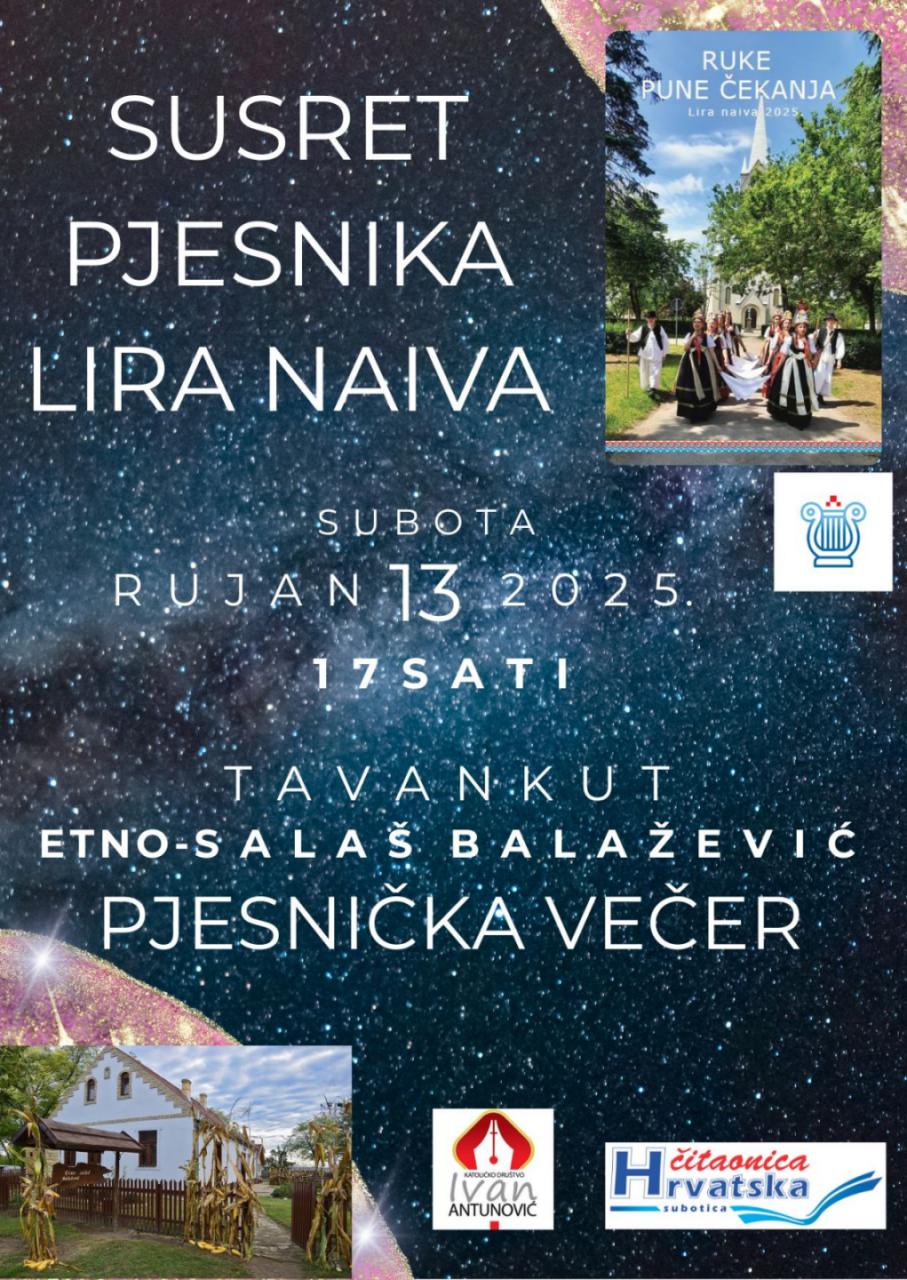 Susret hrvatskih pučkih pjesnika pod nazivom Lira naiva 2025. bit će održan u subotu, 13. rujna 2025. godine u Tavankutu u organizaciji Hrvatske čitaonice i Bunjevačko-šokačke knjižnice Ivan Kujundžić pri Katoličkom društvu Ivan Antunović Subotica.