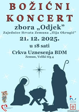 Zajednica Hrvata Zemuna Ilija Okrugić u suradnji s Rimokatoličkom župom Uznesenja BDM Zemun priređuje tradicionalni božićni koncert zbora Odjek u nedjelju 21. prosinca 2025. godine s početkom u 18 sati u crkvi Uznesenja BDM u Zemunu.