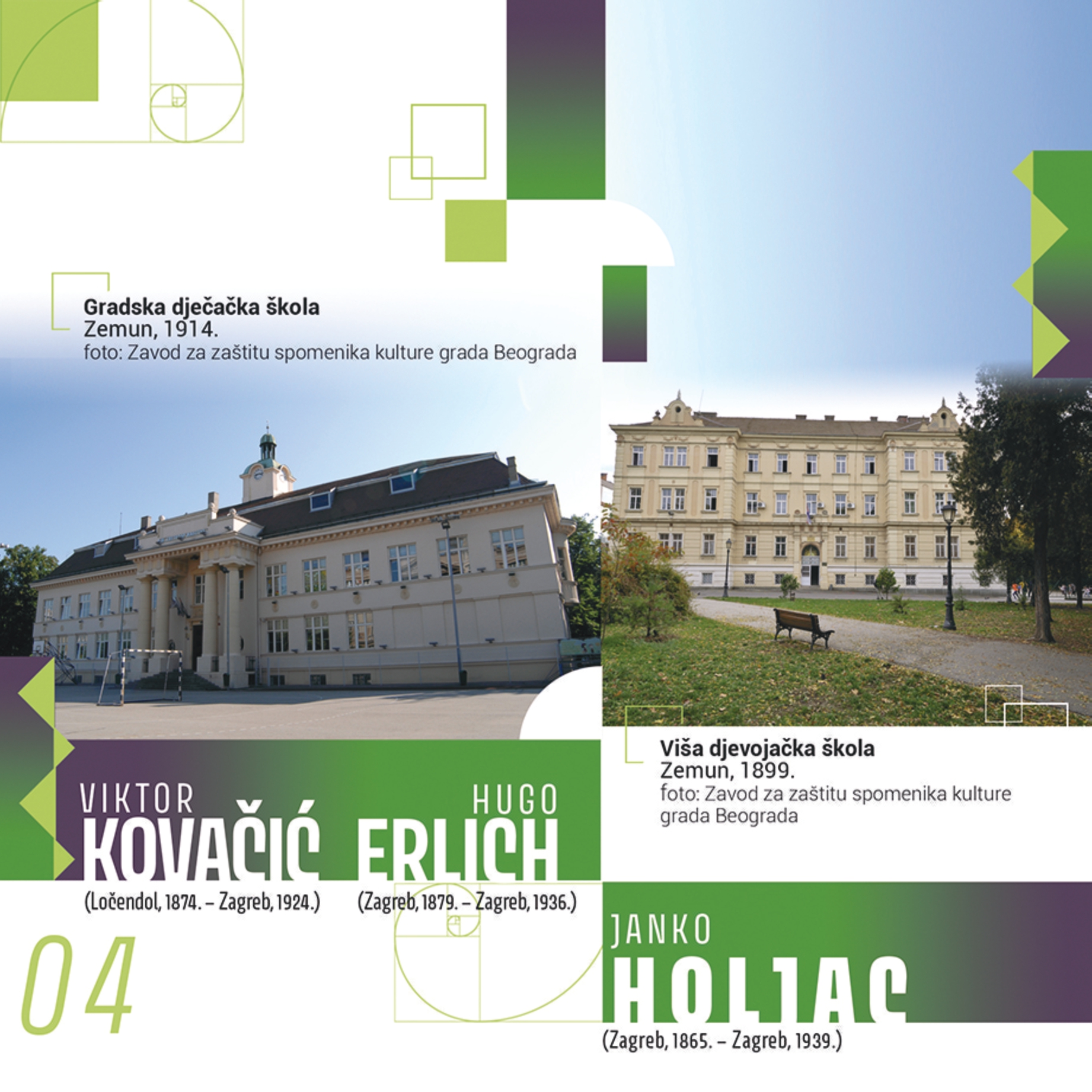 Zajednički kalendar hrvatskih manjinskih institucija u Srbiji za 2026. godinu prikazuje odabrana djela hrvatskih arhitekata u Srbiji. Mjesec travanj predstavljaju dva objekta u Zemunu, Viša djevojačka škola (današnja OŠ Majka Jugovića) i Gradska dječačka škola (danas OŠ Svetozar Miletić).