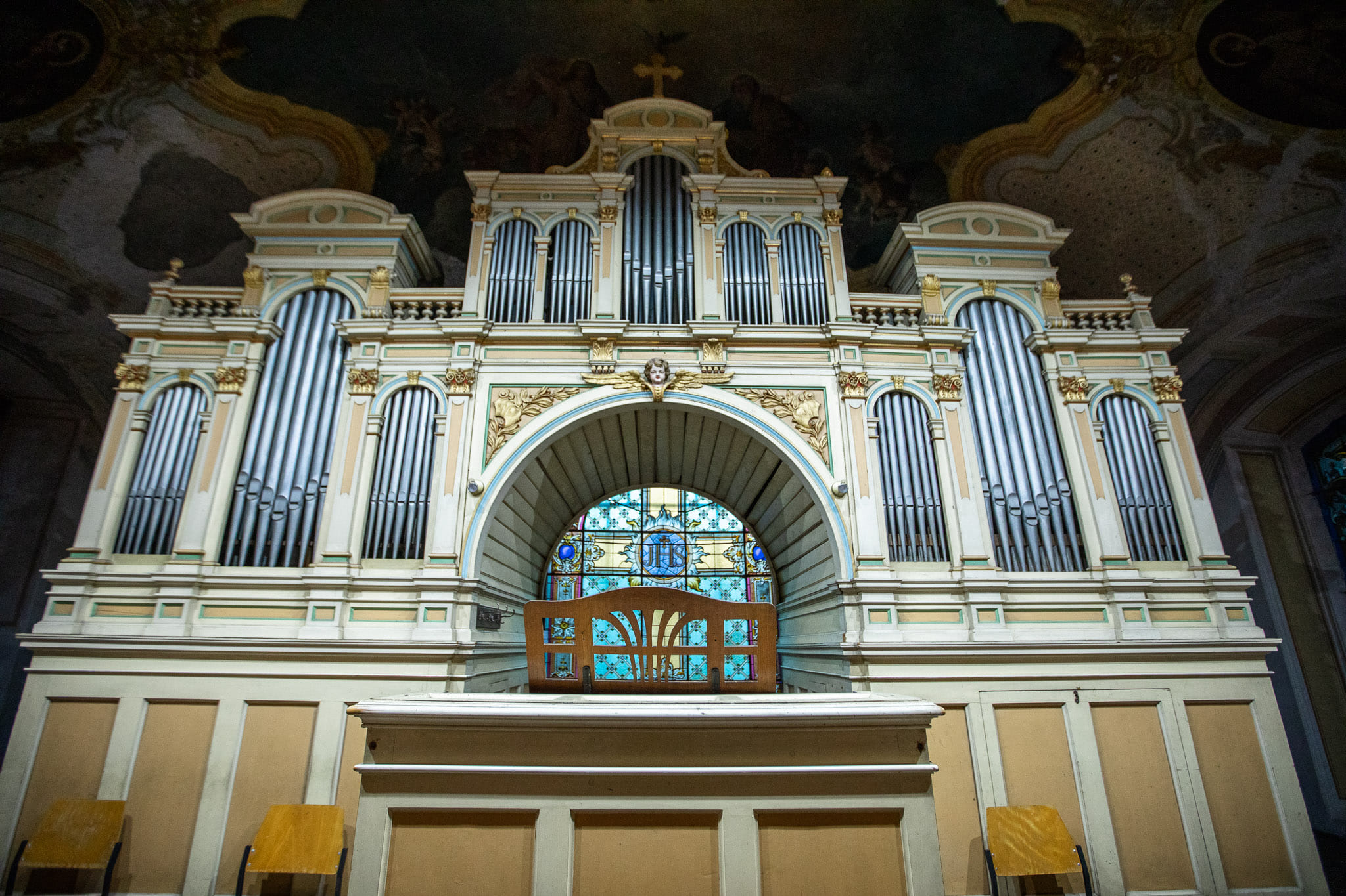 Zidovi crkve su oslikani po predlošcima od strane majstora iz radionice Károlya Jakobeya (1826. – 1891.) slikara rođenog u Kuli a većinu života je živio i radio u Budimpešti. Za studij slikarstva pripremao ga je Jakab (Jacopo) Marastoni, peštanski slikar podrijetlom iz Venecije, a od 1845. Jakobey je studirao na bečkoj akademiji nakon čega se usavršavao u školi Ferdinanda G. Waldmüllera. Početkom 1850-ih nastanio se u Pešti a od 1852. redovito se pojavljuje na izložbama Peštanskog umjetničkog društva, uglavnom sa svojim portretima. Bio je jedan od utemeljitelja Mađarskog nacionalnog društva likovnih umjetnosti, osnovanog 1861. godine te član do svoje smrti. Od 1860-ih Jakobey slika sve više oltarnih pala za crkvene narudžbe. Također se bavio oslikavanjem i restauracijom zidnih oslika. Od 1870-ih intenzivno je radio kao crkveni slikar s Henrikom Altenbuchnerom i Károlyem Greinerom. Njegovi radovi čuvaju se uglavnom u budimpeštanskim zbirkama: nekoliko njegovih pejzaža nalazi se u Mađarskoj nacionalnoj galeriji, portretni radovi u Mađarskoj povijesnoj galeriji, a jedan crtež nalazi se u Ernst Museumu. Treba spomenuti i da se njegova oltarna slika Žalosna gospa iz 1877. nalazi u kapelici subotičke kalvarije.