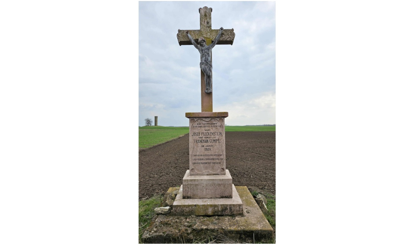 Na križu stoji natpis na njemačkom, u prijevodu „Iz zahvalnosti na slavu Božju darovali Josef Fleckenstein i supruga Franciska Gumpl godine 1935.“. Ispod stoji citat iz Svetog pisma, napisan na njemačkom, hrvatskom i mađarskom jeziku „Ljubi bližnjega svojega kao samoga sebe“.