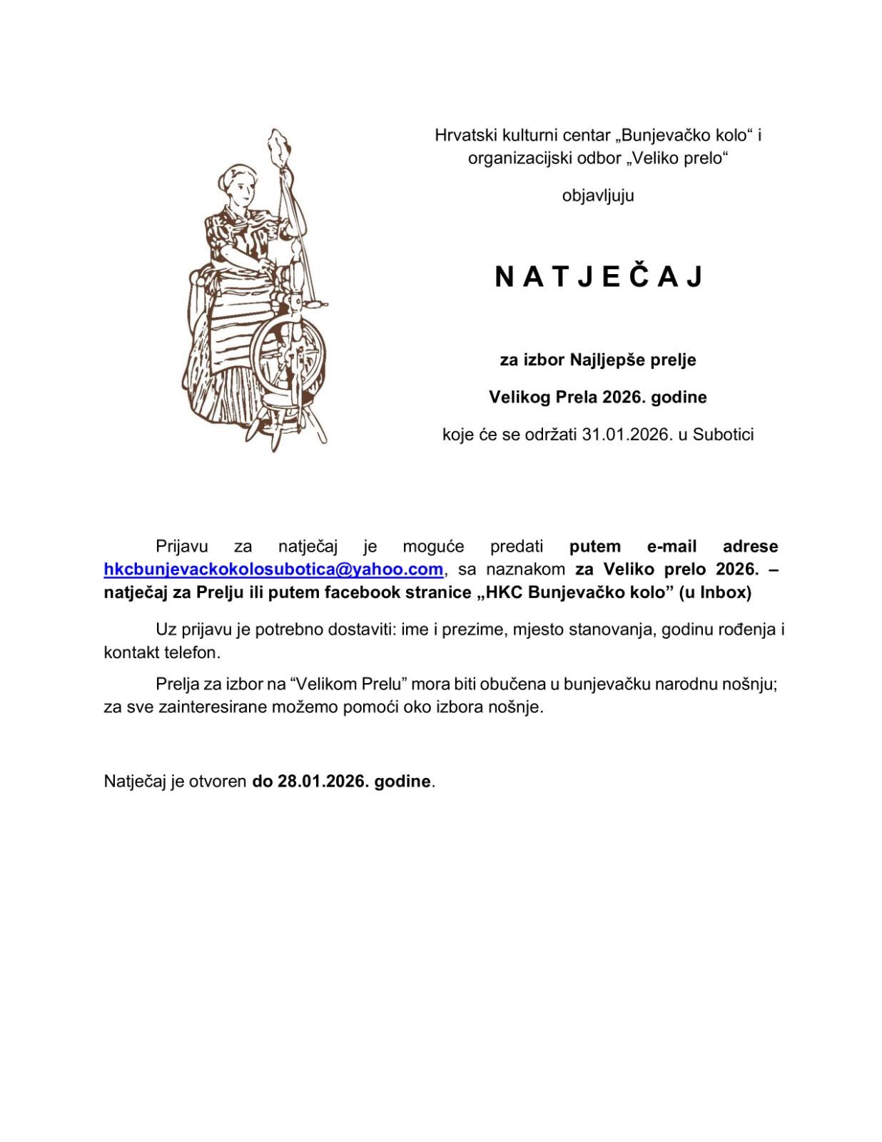 Hrvatski kulturni centar Bunjevačko kolo i organizacijski odbor Veliko prelo objavljuju natječaj za izbor najljepše prelje Velikog Prela 2026. koje će se održati 31. siječnja 2026. godine u Subotici.