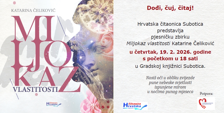 Hrvatska čitaonica Subotica priređuje predstavljanje pjesničke zbirke Miljokaz vlastitosti Katarine Čeliković u četvrtak, 19. veljače 2026. godine s početkom u 18 sati u Gradskoj knjižnici Subotica.