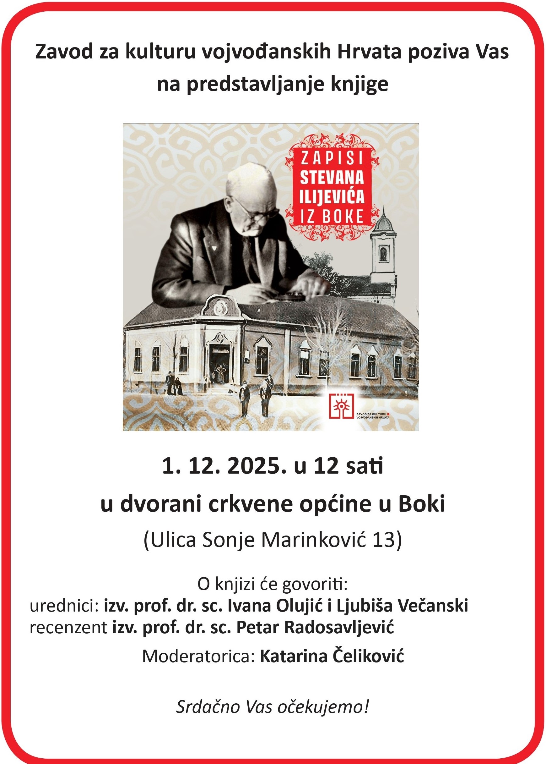 Knjiga Zapisi Stevana Ilijevića iz Boke bit će predstavljena u ponedjeljak, 1. prosinca 2025. godine, s početkom u 12 sati u dvorani crkvene općine u Boki (Ulica Sonje Marinković 13).