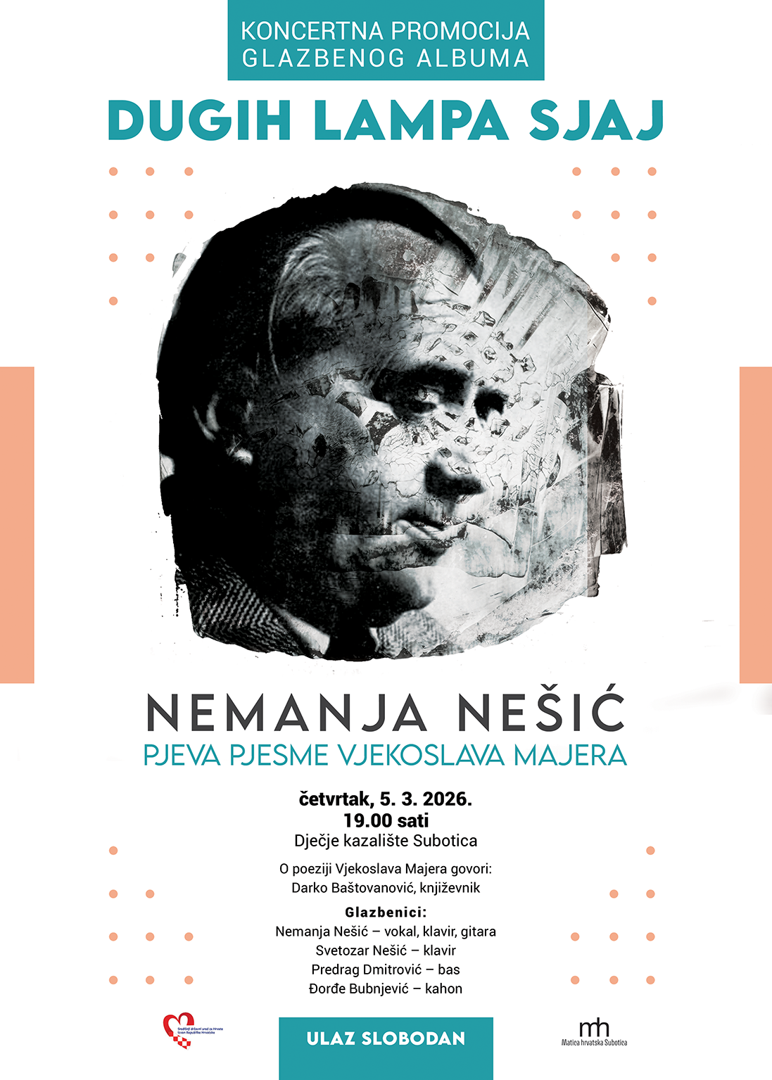 Promocija glazbenog albuma Dugih lampa sjaj bit će održana u četvrtak, 5. ožujka 2026. godine, u Dječjem kazalištu Subotica s početkom u 19 sati. O poeziji Vjekoslava Majera govorit će književnik Darko Baštovanović, dok će kompozicije izvesti glazbenici Nemanja i Svetozar Nešić, Predrag Dmitrović i Đorđe Bubnjević.