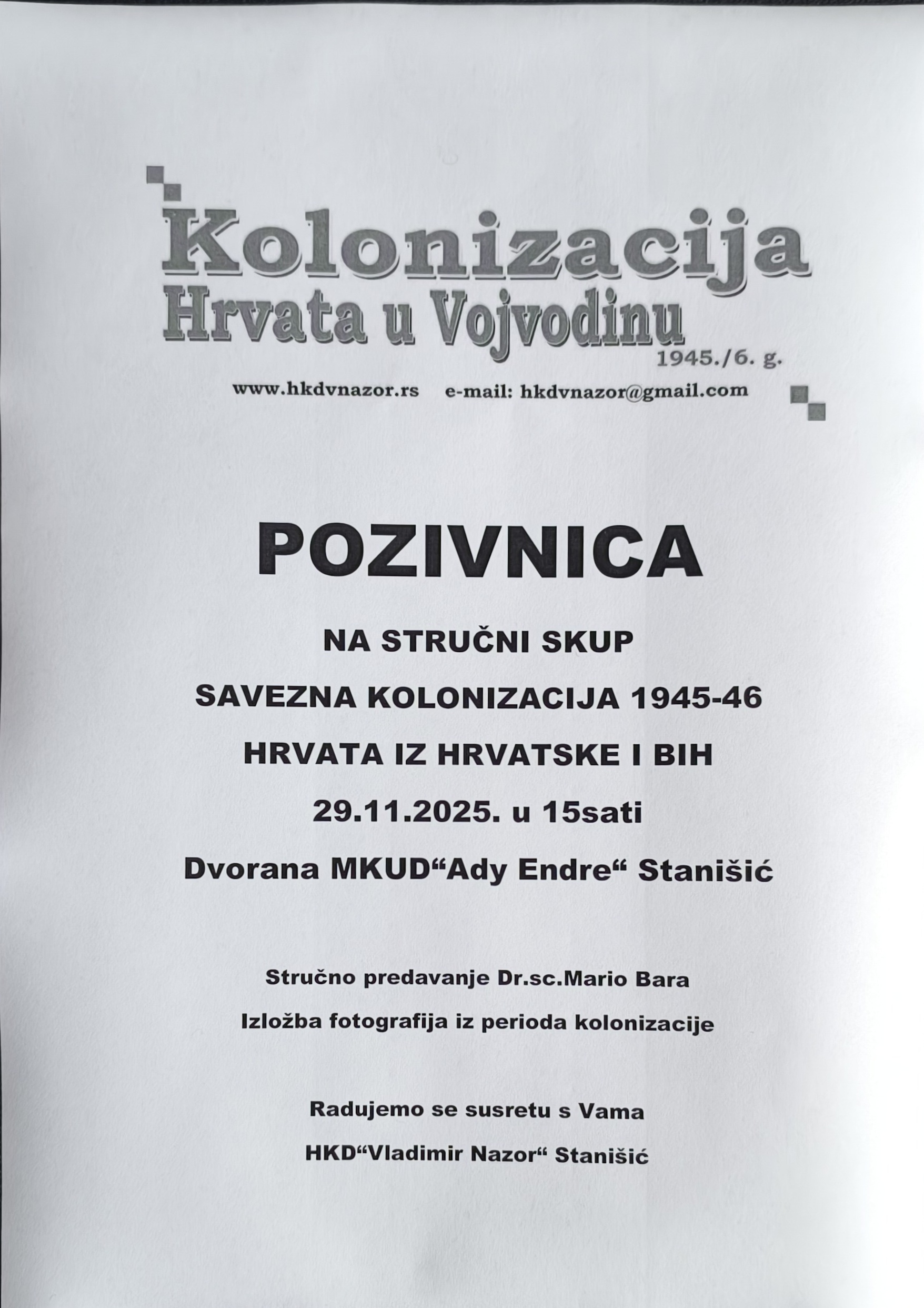HKD Vladimir Nazor iz Stanišića organizira stručni skup na temu Savezna kolonizacija 1945./46. Hrvata iz Hrvatske i BiH u subotu, 29. studenog 2025. godine, s početkom u 15 sati u dvorani MKUD-a Ady Endre u Stanišiću.
