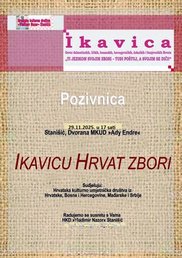 HKD Vladimir Nazor iz Stanišića organizira manifestaciju Ikavicu Hrvat zbori posvećenu govoru dalmatinskih, ličkih, bosanskih, hercegovačkih, šokačkih i bunjevačkih Hrvata. Manifestacija će biti održana u subotu, 29. studenog 2025. godine, u dvorani MKUD-a Ady Endre u Stanišiću, s početkom u 17 sati.