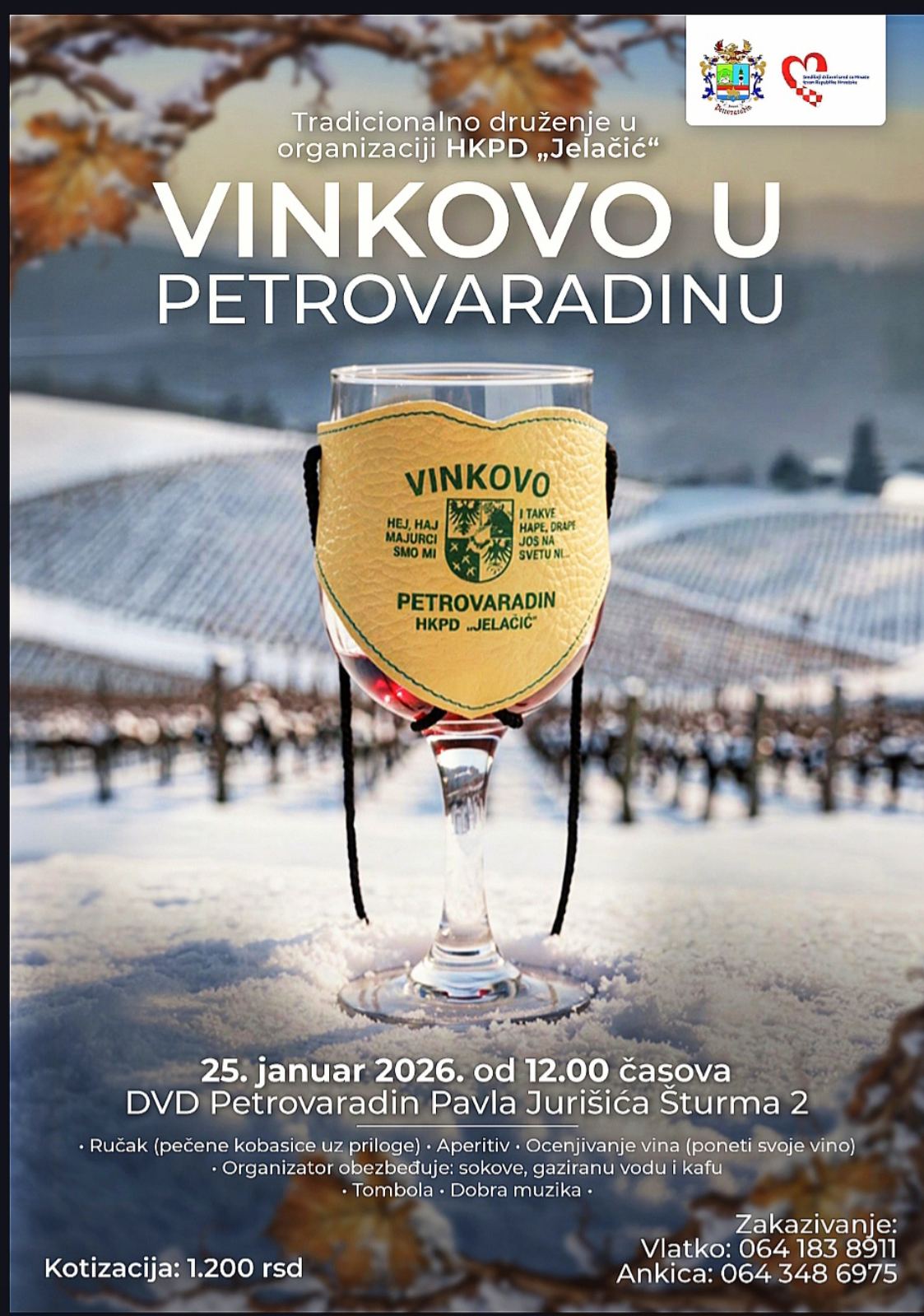 Hrvatsko kulturno-prosvjetno društvo Jelačić iz Petrovaradina odlučilo je obnoviti svečaniju proslavu blagdana sv. Vinka, zaštitnika vinograda, vinogradara te svih koji se bave podrumarstvom i proizvodnjom vina. Proslava Vinkova u Petrovaradinu održat će se u nedjelju, 25. siječnja 2026. godine, u prostorijama DVD-a Petrovaradin. Program počinje od 12 sati i uključuje druženje uz tamburaše, zajednički ručak, aperitiv te ocjenjivanje vina.