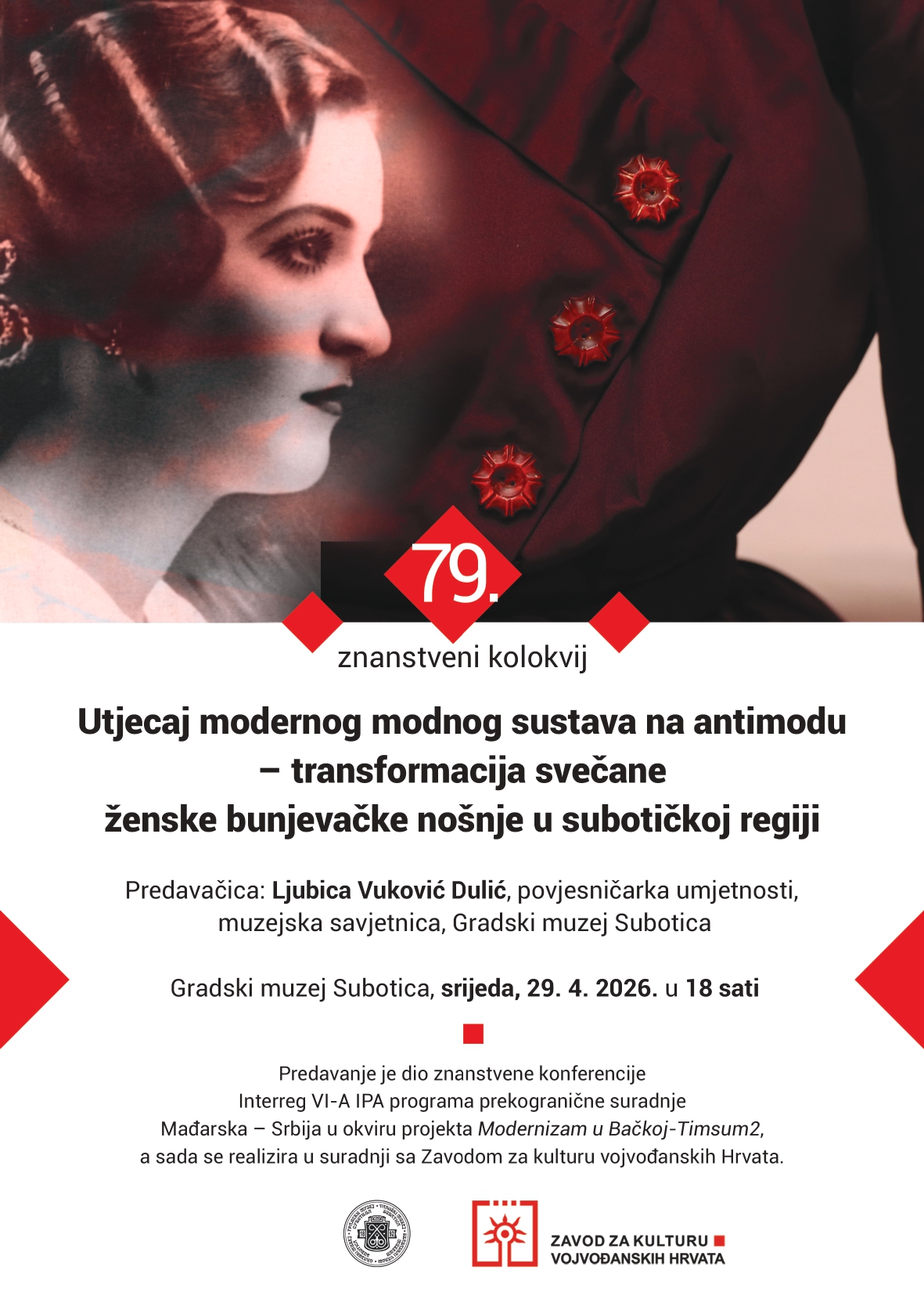 Zavod za kulturu vojvođanskih Hrvata priređuje 79. Znanstveni kolokvij pod naslovom Utjecaj modernog modnog sustava na antimodu – transformacija svečane ženske bunjevačke nošnje u subotičkoj regiji. Predavačica je Ljubica Vuković Dulić, povjesničarka umjetnosti i muzejska savjetnica u Gradskom muzeju Subotica. Kolokvij u formi predavanja održat će se u srijedu 29. travnja 2026. u Gradskom muzeju Subotica s početkom u 18 sati.