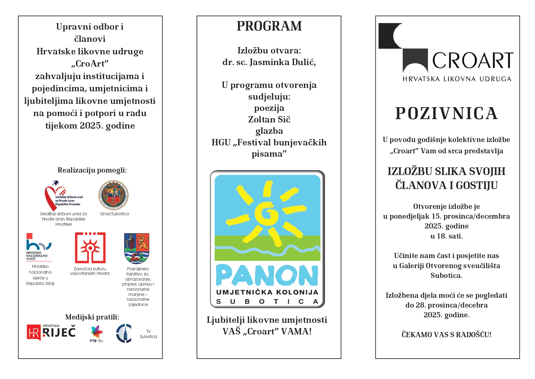 Hrvatska likovna udruga Croart organizira redovitu godišnju izložbu slika svojih članova i gostiju nastalih na Umjetničkoj koloniji Panon 2025. Izložba se otvara u Galeriji Otvorenog sveučilišta Subotica u ponedjeljak 15. prosinca u 18 sati a svečano će ju otvoriti dr Jasminka Dulić. U programu otvorenja će sudjelovati Zoltan Sič (poezija) te HGU Festival bunjevački' pisama.