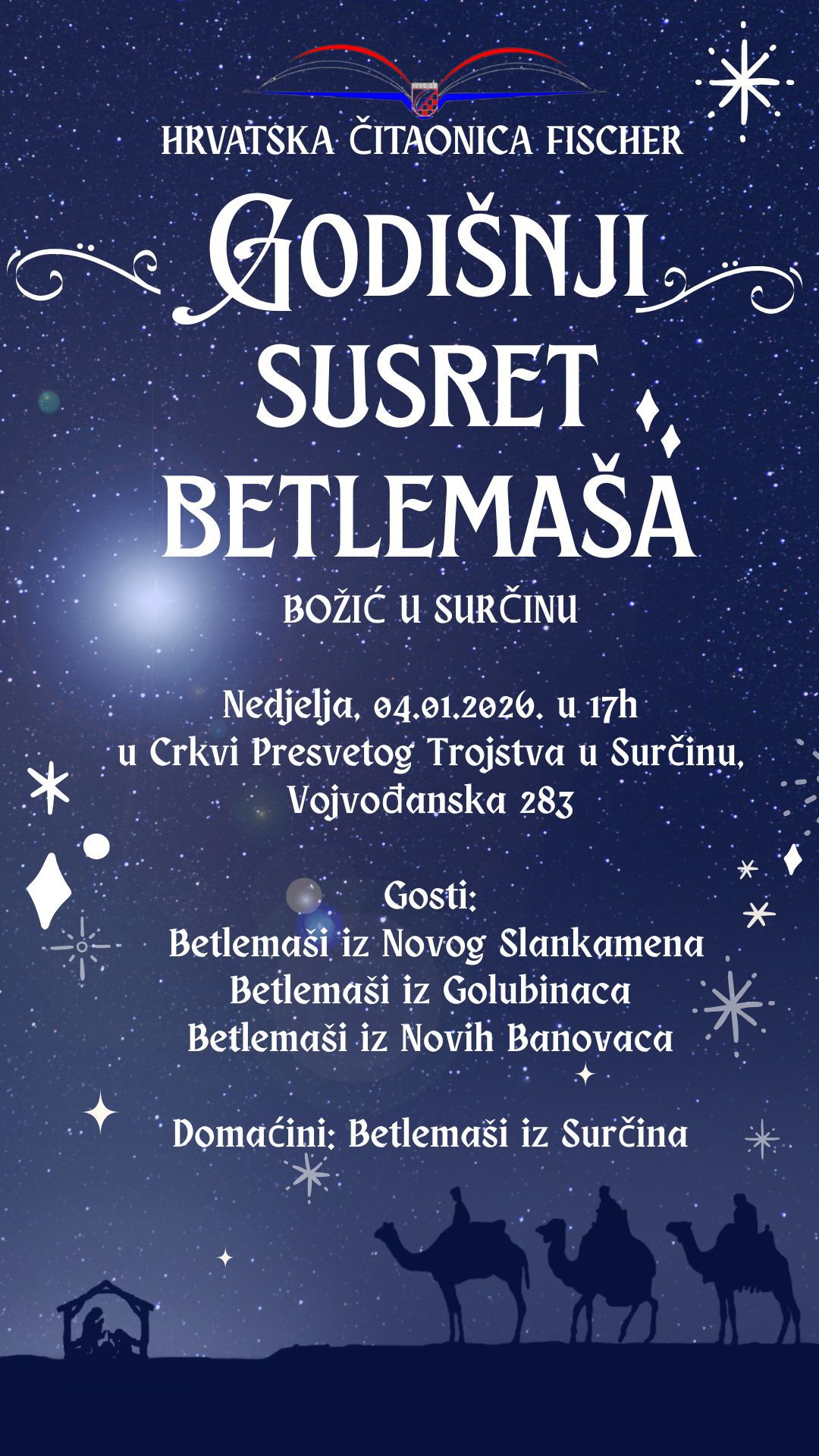 Hrvatska čitaonica Fischer iz Surčina priređuje Godišnji susret betlemaša u nedjelju, 4. siječnja 2026. godine u crkvi Presvetog Trojstva, na adresi Vojvođanska 283 u Surčinu s početkom u 17 sati.