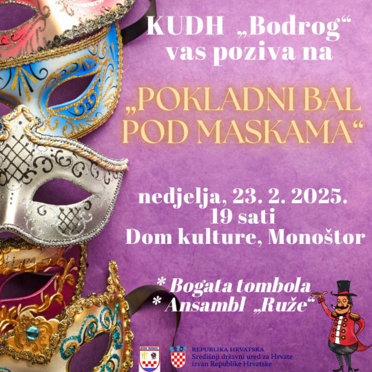 Kulturno-umjetničko društvo Hrvata Bodrog organizira Pokladni bal pod maskama u nedjelju 23. veljače 2025. godine u Domu kulture u Monoštoru u 19 sati.