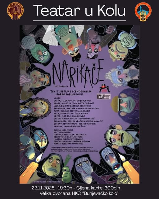 U okviru programa Teatar u Kolu, u četvrtak 22. studenoga 2025. u Velikoj dvorani Hrvatskog kulturnog centra Bunjevačko kolo u Subotici, bit će izvedena predstava Narikače u izvedbi kazališta Mika Živković iz Retkovaca (Hrvatska). Cijena karte je 300 rsd.