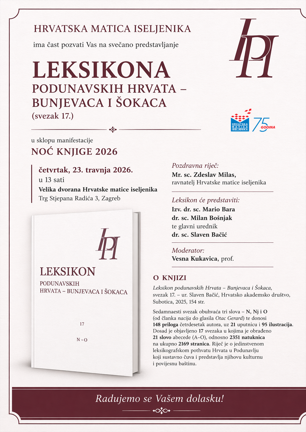 Hrvatska matica iseljenika i Hrvatsko akademsko društvo iz Subotice priređuju predstavljanje Leksikona podunavskih Hrvata – Bunjevaca i Šokaca, svezak 17., koje će se održati u sklopu manifestacije Noć knjige u četvrtak 23. travnja 2026. s početkom u 13 sati u Velikoj dvorani HMI, Trg Stjepana Radića 3, Zagreb.