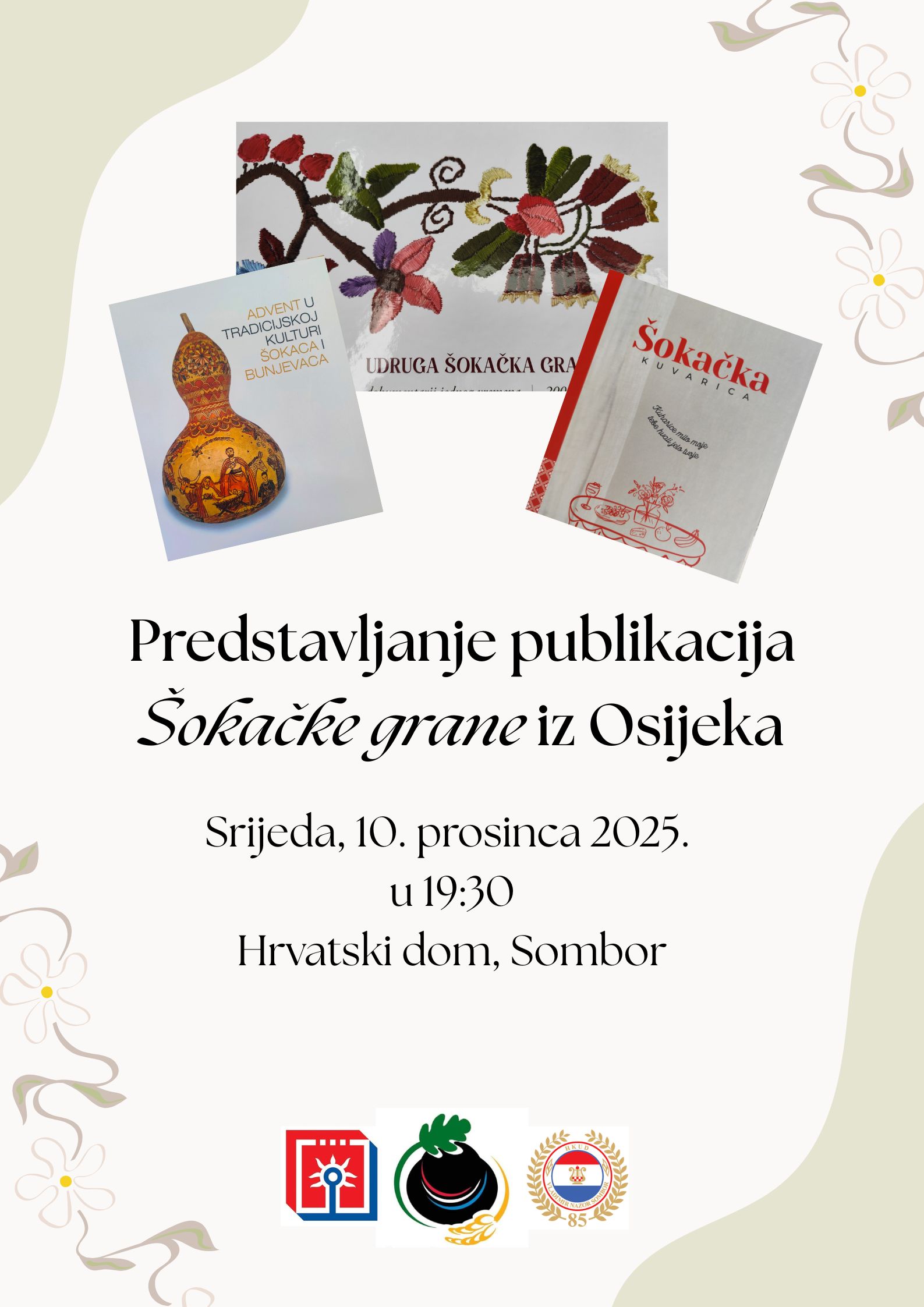 Predstavljanje triju izdanja — zbornika Advent u tradicijskoj kulturi Šokaca i Bunjevaca, monografije Udruga Šokačka grana Osijek – dokumentarij jednog vremena (2005.–2020.) i Šokačke kuvarice — održat će se u srijedu 10. prosinca 2025. u 19.30 sati u Hrvatskom domu u Somboru. Zbornik će predstaviti Goran Đaković i Ljubica Pilipović iz Osijeka, te Senka Davčik etnologinja i stručna suradnica za kulturne projekte i programe u Zavodu za kulturu vojvođankih Hrvata. Domaćin predstavljanja u Somboru je HKUD Vladimir Nazor, a organizatori su Udruga Šokačka grana iz Osijeka i Zavod za kulturu vojvođanskih Hrvata iz Subotice.