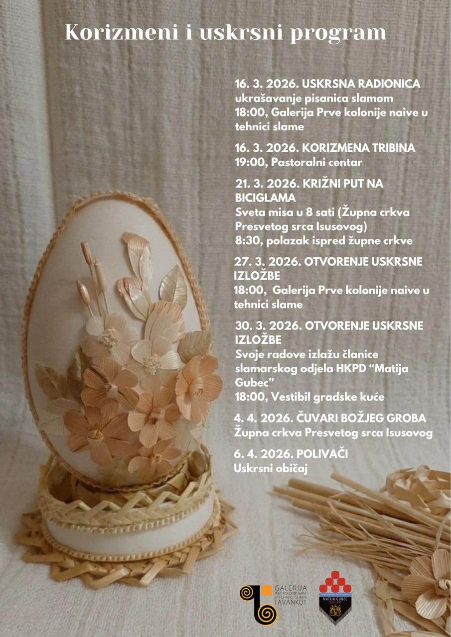 HKPD Matija Gubec iz Tavankuta u sklopu Korizmenog i uskrsnog programa priređuje Uskrsnu radionicu – ukrašavanje pisanica slamom, 16. ožujka 2026. godine s početkom u 18 sati u prostorijama Galerije Prve kolonije naive u tehnici slame.