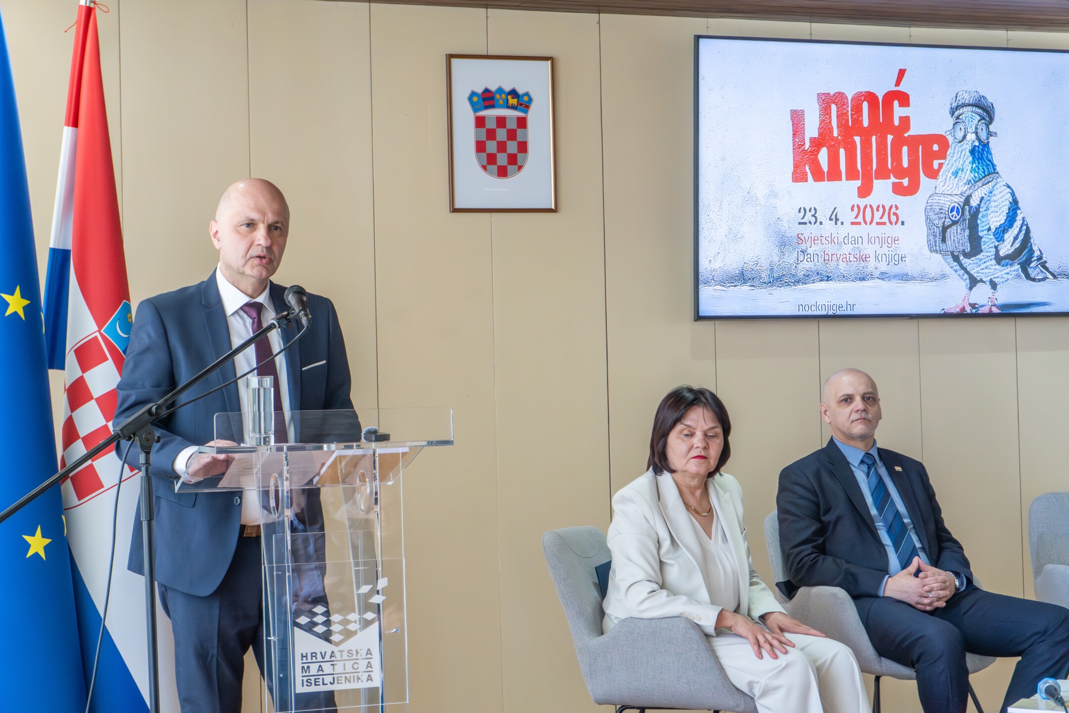 Pozdravnu riječ u ime domaćina Hrvatske matice iseljenika uputio je ravnatelj mr. sc. Zdeslav Milas. Između ostalog ravnatelj je istaknuo je kako je prestižna kulturna manifestacija Noć knjige, tradicionalno vezana na Dan hrvatske knjige koji se obilježava u spomen na 22. travnja kada je prije više od pola tisućljeća otac hrvatske književnosti Marko Marulić dovršio spjev Judita, dok se 23. travnja obilježava Svjetski dan knjige i autorskih prava prema UNESCO-voj inicijativi u cilju promicanja kulture čitanja, izdavaštva i zaštite autorskih prava pisaca. „Odjel za nakladništvo Hrvatske matice iseljenika od početka sudjeluje u manifestaciji Noć knjige čiji se programi odvijaju u više od 250 gradova i mjesta diljem Hrvatske – ukazujući na bogatstvo i značaj knjiga, a osobito onih posvećenih Hrvatima izvan domovine. Matičina uloga u proteklih 15 Noći knjige, iako skromna, učinila je vidljivom iseljeničku knjigu svih žanrova od poezije, drame do proze. Inozemna se Croatica, uz hrvatski jezik, pojavljuje na desetak jezika svijeta, a najčešće na španjolskome, engleskome i njemačkom, uključujući jezike iz našeg europskog susjedstva. Hrvatska matica iseljenika u okviru Noći knjige redovito promovira autore iz dijaspore i domovine koji pišu znanstvene knjige o Hrvatima izvan Republike Hrvatske s područja sociologije, etnologije, povijesti migracija, ali i izazova suvremene mobilnosti u Hrvata“, istaknuo je ravnatelj Milas.