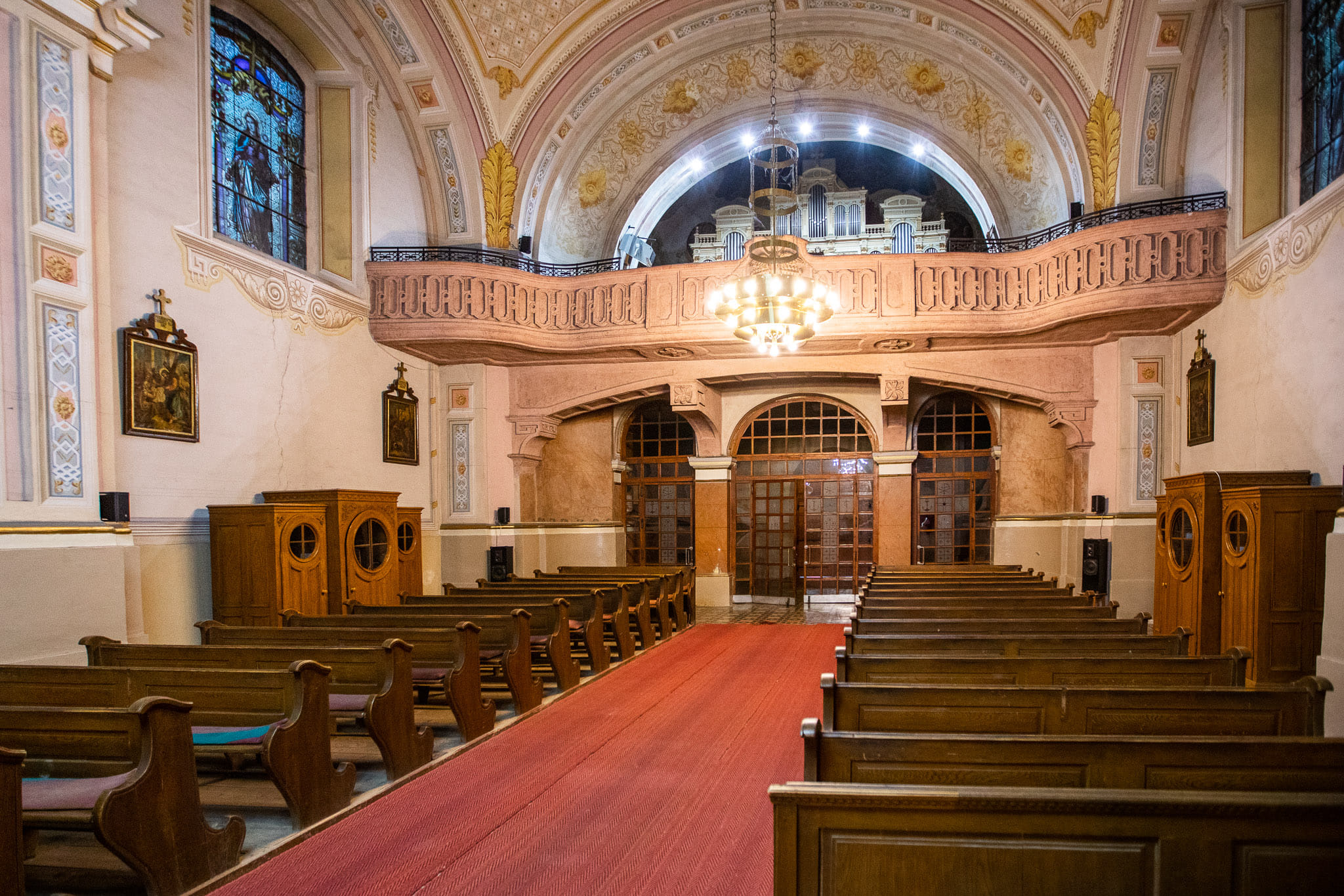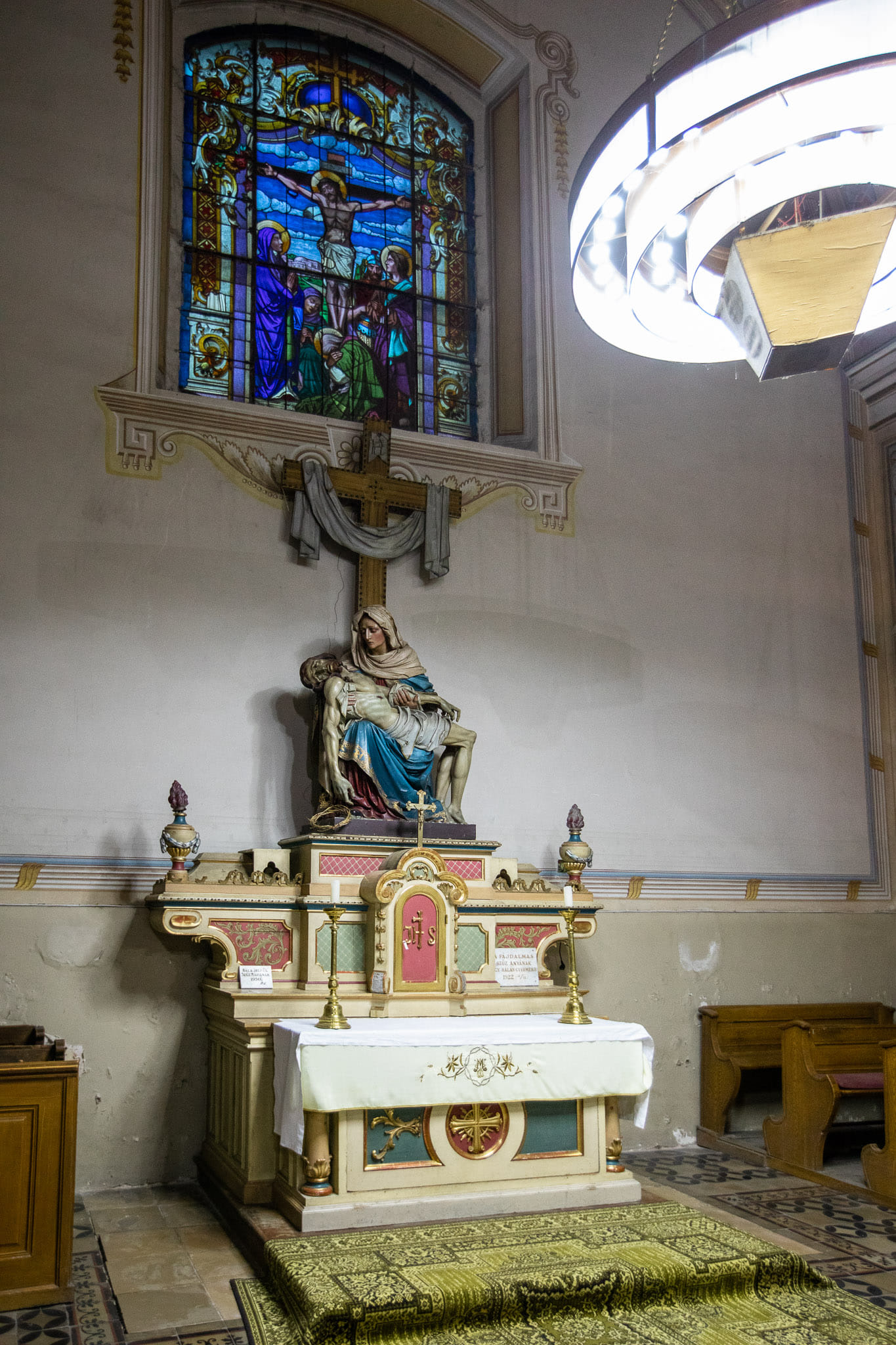 Zidovi crkve su oslikani po predlošcima od strane majstora iz radionice Károlya Jakobeya (1826. – 1891.) slikara rođenog u Kuli a većinu života je živio i radio u Budimpešti. Za studij slikarstva pripremao ga je Jakab (Jacopo) Marastoni, peštanski slikar podrijetlom iz Venecije, a od 1845. Jakobey je studirao na bečkoj akademiji nakon čega se usavršavao u školi Ferdinanda G. Waldmüllera. Početkom 1850-ih nastanio se u Pešti a od 1852. redovito se pojavljuje na izložbama Peštanskog umjetničkog društva, uglavnom sa svojim portretima. Bio je jedan od utemeljitelja Mađarskog nacionalnog društva likovnih umjetnosti, osnovanog 1861. godine te član do svoje smrti. Od 1860-ih Jakobey slika sve više oltarnih pala za crkvene narudžbe. Također se bavio oslikavanjem i restauracijom zidnih oslika. Od 1870-ih intenzivno je radio kao crkveni slikar s Henrikom Altenbuchnerom i Károlyem Greinerom. Njegovi radovi čuvaju se uglavnom u budimpeštanskim zbirkama: nekoliko njegovih pejzaža nalazi se u Mađarskoj nacionalnoj galeriji, portretni radovi u Mađarskoj povijesnoj galeriji, a jedan crtež nalazi se u Ernst Museumu. Treba spomenuti i da se njegova oltarna slika Žalosna gospa iz 1877. nalazi u kapelici subotičke kalvarije.