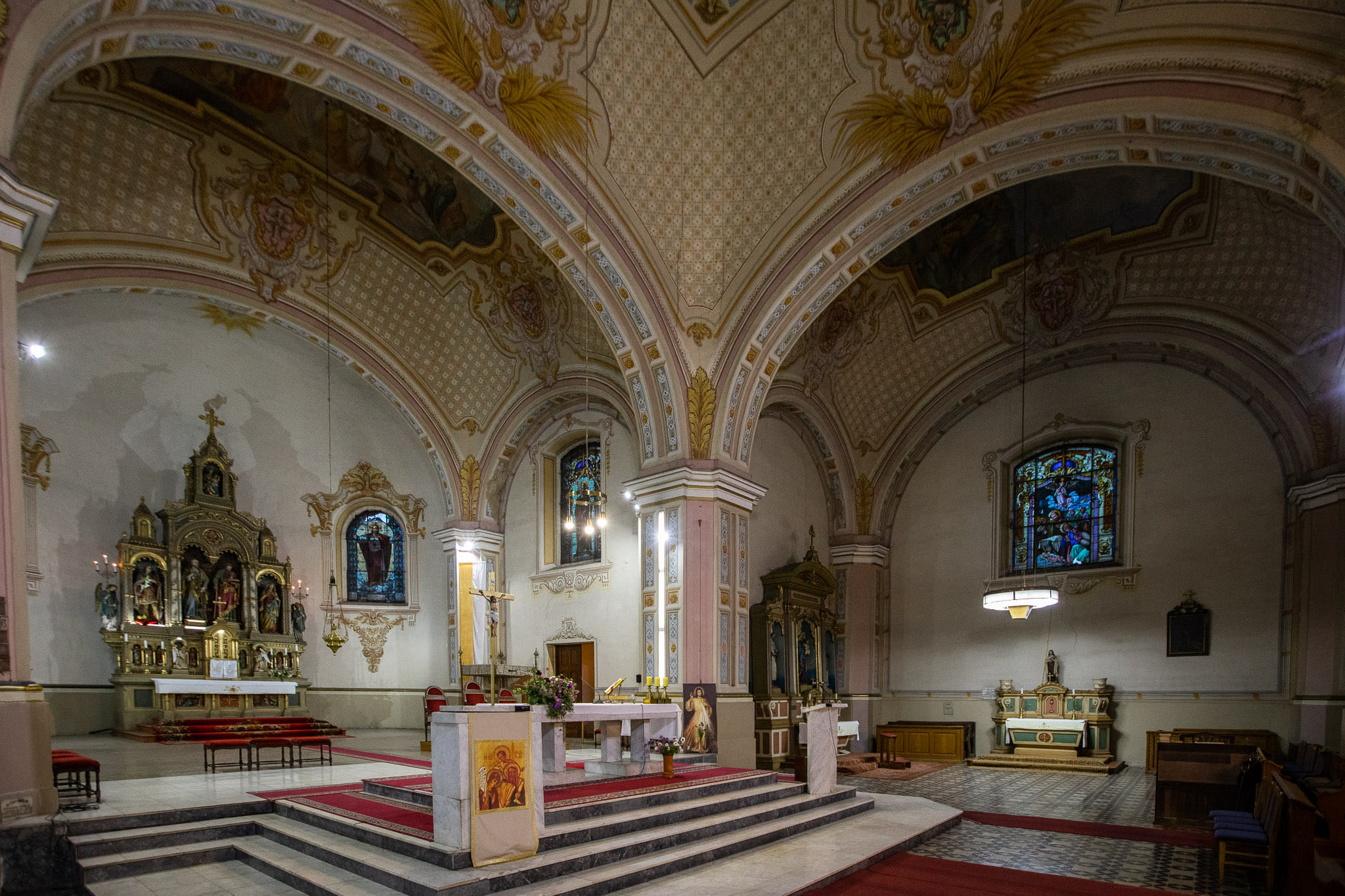 Oltari bajmačke crkve, kako glavni tako i sporedni te pripadajući im kipovi, pribavljeni su od strane poznate tirolske radionice obitelji Stuflesser. Vitraji sa likovima svetaca napravljeni su u peštanskoj radionici Imrea Zselléra (1878. – 1959.) čija se djela nalaze u brojnim važnim objektima tadašnje monarhije, pa tako i u subotičkoj Gradskoj kući. Imre Zsellér rođen je 1878. godine u Budimpešti, učio je u radionici Mikse Rótha a 1903. godine otvara vlastitu radionicu. On je autor vitraja na brojnim javnim zgradama i na više od stotinu crkava, a najpoznatiji rad je svakako izrada prozora za koncertnu dvoranu Nádor u Pešti. Značajna djela ostvario je i kao mozaičar. Izradio je 1917. godine najveći mozaik u srednjoj Europi za župnu crkvu Svete Obitelji u Zugligetu. Izvan Budimpešte, većinu radova ostvario je u kaločkoj nadbiskupiji a radio je skupa s Gyulom Petrovczem, koji je dvadeset i pet godina bio glavni arhitekt nadbiskupije. Zsellér je, gotovo bez iznimke, izradio prozore za sve crkve izgrađene ili obnovljene u biskupiji tijekom ovih godina.