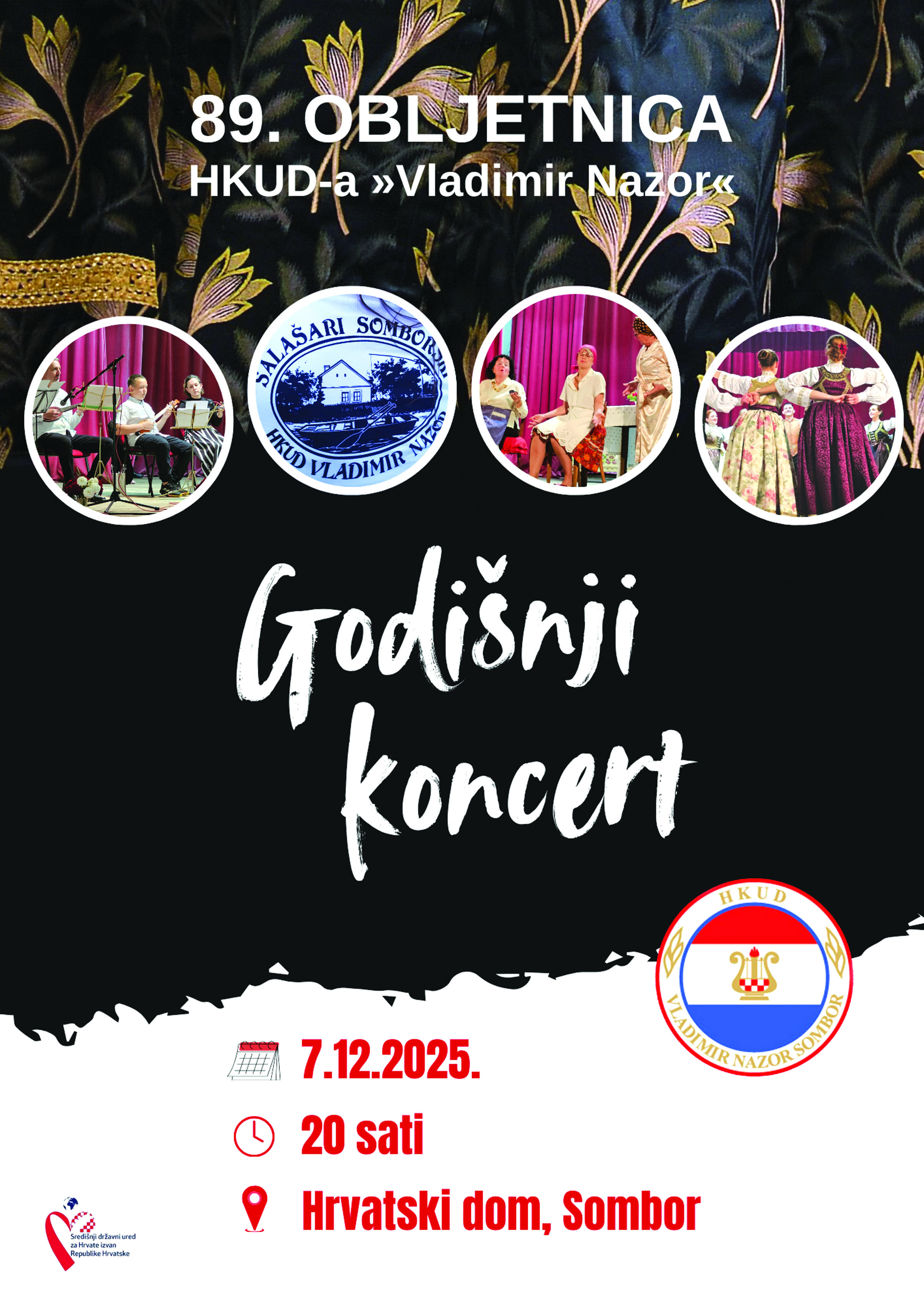 Hrvatsko kulturno-umjetničko društvo Vladimir Nazor iz Sombora godišnjim koncertom obilježava 89. obljetnicu osnutka u nedjelju 7. prosinca 2025. s početkom programa u 19.30. Koncert će se održati u Velikoj dvorani Hrvatskoga doma u Somboru, a tijekom programa bit će predstavljen rad sekcija Nazora u protekloj godini. Ulaz je slobodan.