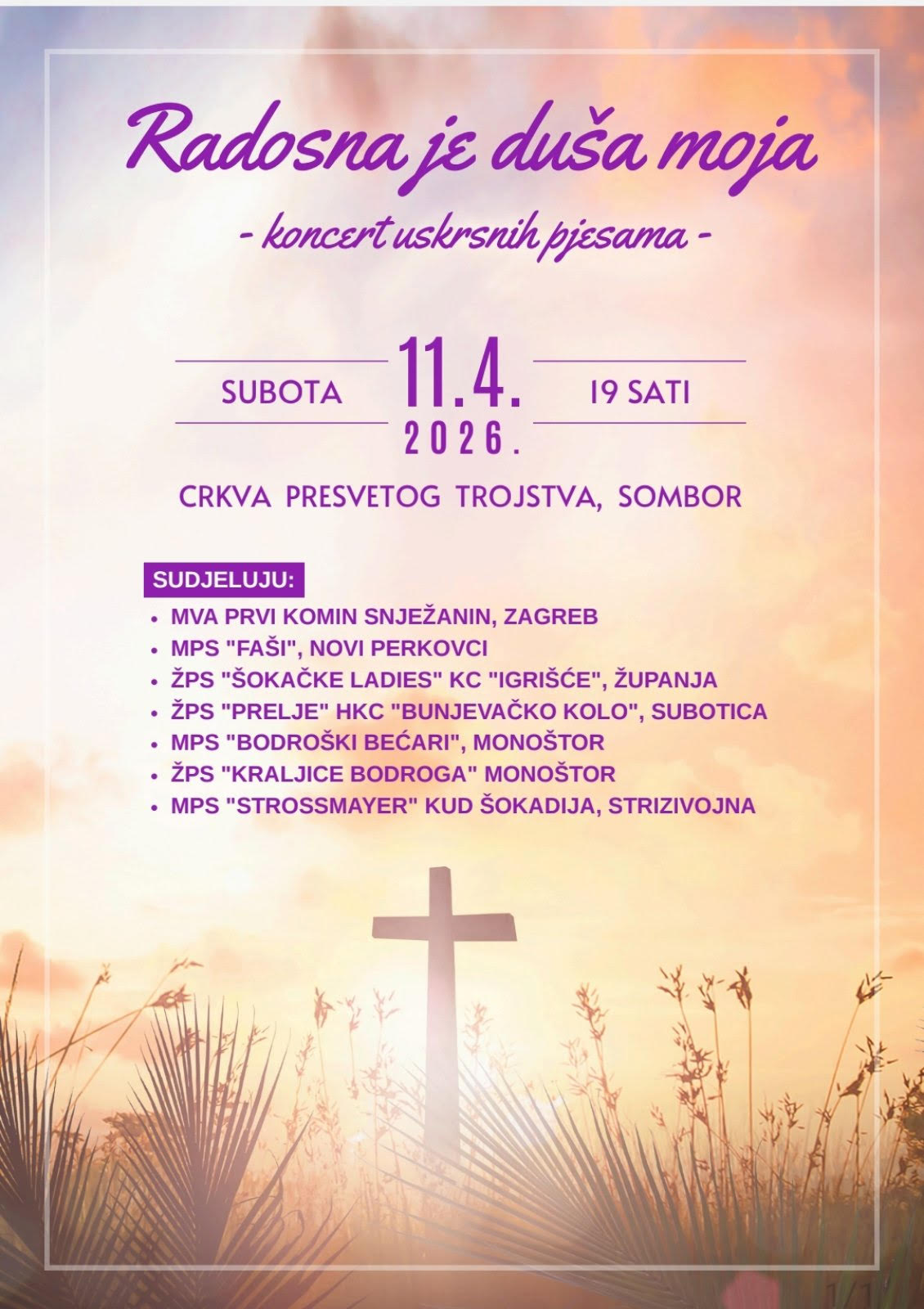U subotu 11. travnja 2026. godine u crkvi Presvetog Trojstva u Somboru održat će se koncert uskrsnih pjesama pod naslovom Radosna je duša moja.