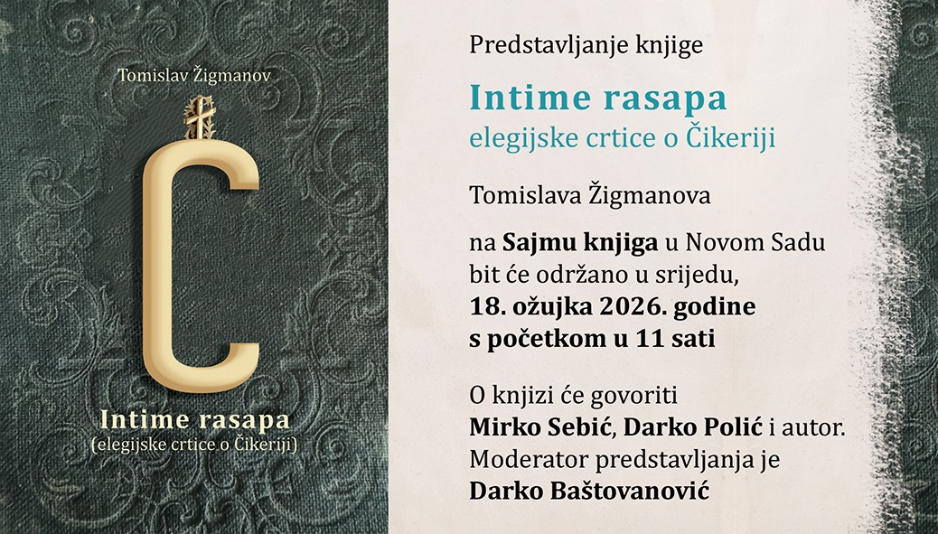 Predstavljanje knjige poezije Intime rasapa – elegijske crtice o Čikeriji autora Tomislava Žigmanova bit će održano u okviru Sajma knjiga u Novom Sadu u srijedu, 18. ožujka 2026. godine, s početkom u 11 sati na bini u Hali 1.