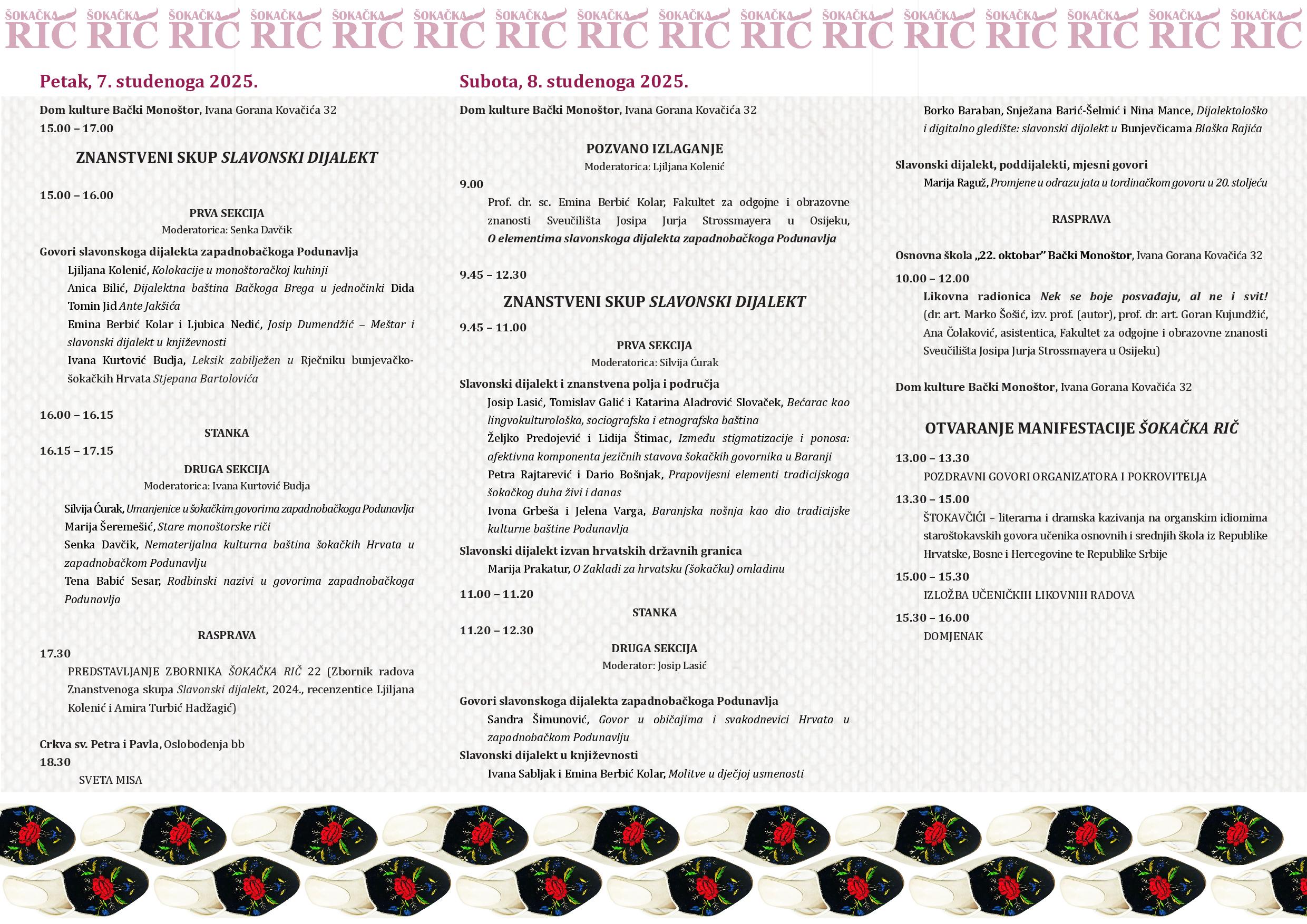 23. Znanstveni skup Slavonski dijalekt u okviru znanstvene, književne i kulturne manifestacije Šokačka rič 23 kojemu je središnja tema Govori slavonskoga dijalekta zapadnobačkoga Podunavlja održat će se 7. i 8. studenoga 2025. godine u Monoštoru, u organizaciji Fakulteta za odgojne i obrazovne znanosti Sveučilišta Josipa Jurja Strossmayera u Osijeku, Sveučilišta Josip Jurja Strossmayera u Osijeku, ZAKUD-a Vinkovci, Zavoda za kulturu vojvođanskih Hrvata u Subotici, Hrvatskoga nacionalnog vijeća u Republici Srbiji, Kulturno-umjetničkoga društva Hrvata Bodrog iz Monoštora i Osnovne škole 22. oktobar Bački Monoštor te uz pokroviteljstvo Ministarstva kulture i medija Republike Hrvatske, Ministarstva znanosti, obrazovanja i mladih Republike Hrvatske i Središnjega državnog ureda za Hrvate izvan Republike Hrvatske.