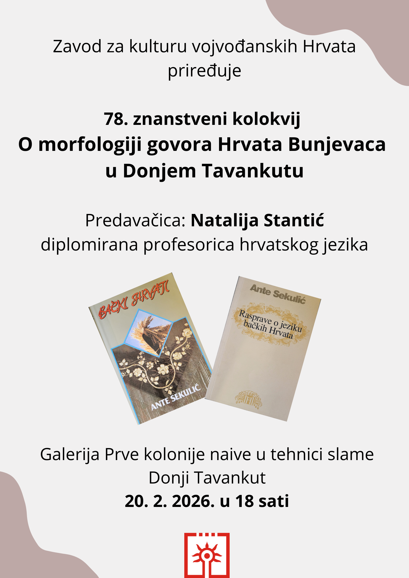 Uoči Međunardnog dana materinskog jezika Zavod za kulturu vojvođanskih Hrvata organizira 78. znanstveni kolokvij na temu O morfologiji govora Hrvata Bunjevaca u Donjem Tavankutu, koji će se održati u petak 20. veljače 2026. godine s početkom u 18 sati u Galeriji Prve kolonije naive u tehnici slame u Donjem Tavankutu (Marka Oreškovića 3).