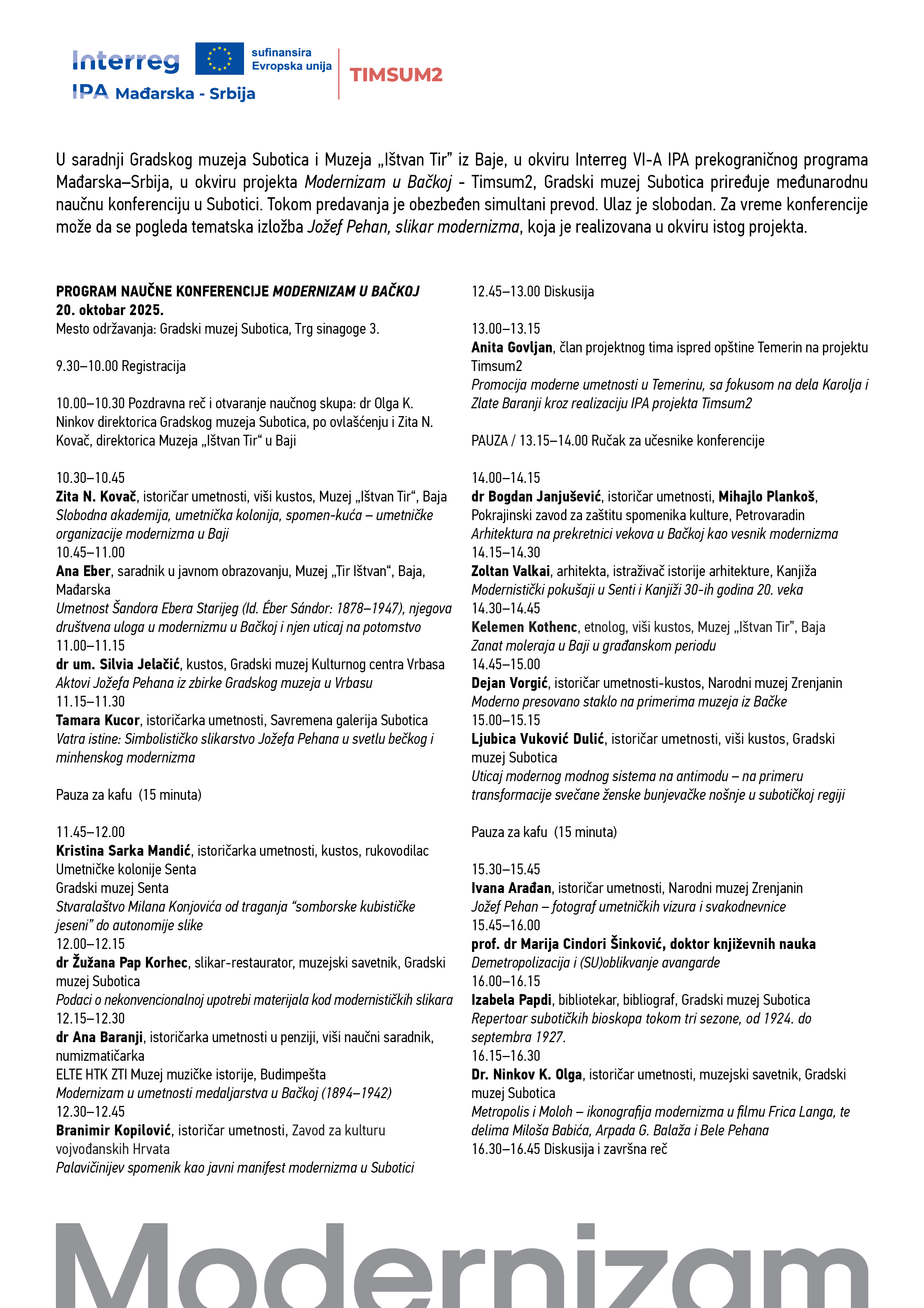 U suradnji Gradskog muzeja Subotica i Muzeja „Ištvan Tir” iz Baje, u okviru Interreg VI-A IPA prekograničnog programa Mađarska–Srbija, u okviru projekta Modernizam u Bačkoj - Timsum2, Gradski muzej Subotica priređuje međunarodnu znanstvenu konferenciju u Subotici u ponedjeljak 20. listopada 2025. s početkom u 10 sati. Tijekom predavanja je osiguran simultani prijevod. Ulaz je slobodan.