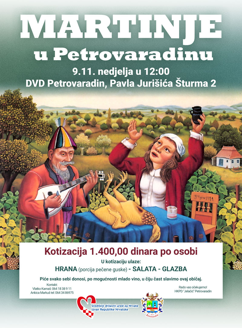 HKPD Jelačić iz Petrovaradina priređuje obilježavanje Martinja u nedjelju 9. studenoga u prostorijama Dobrovoljnog vatrogasnog društva Petrovaradin, ulica Pavla Jurišića Šturma 2, s početkom u 12 sati.