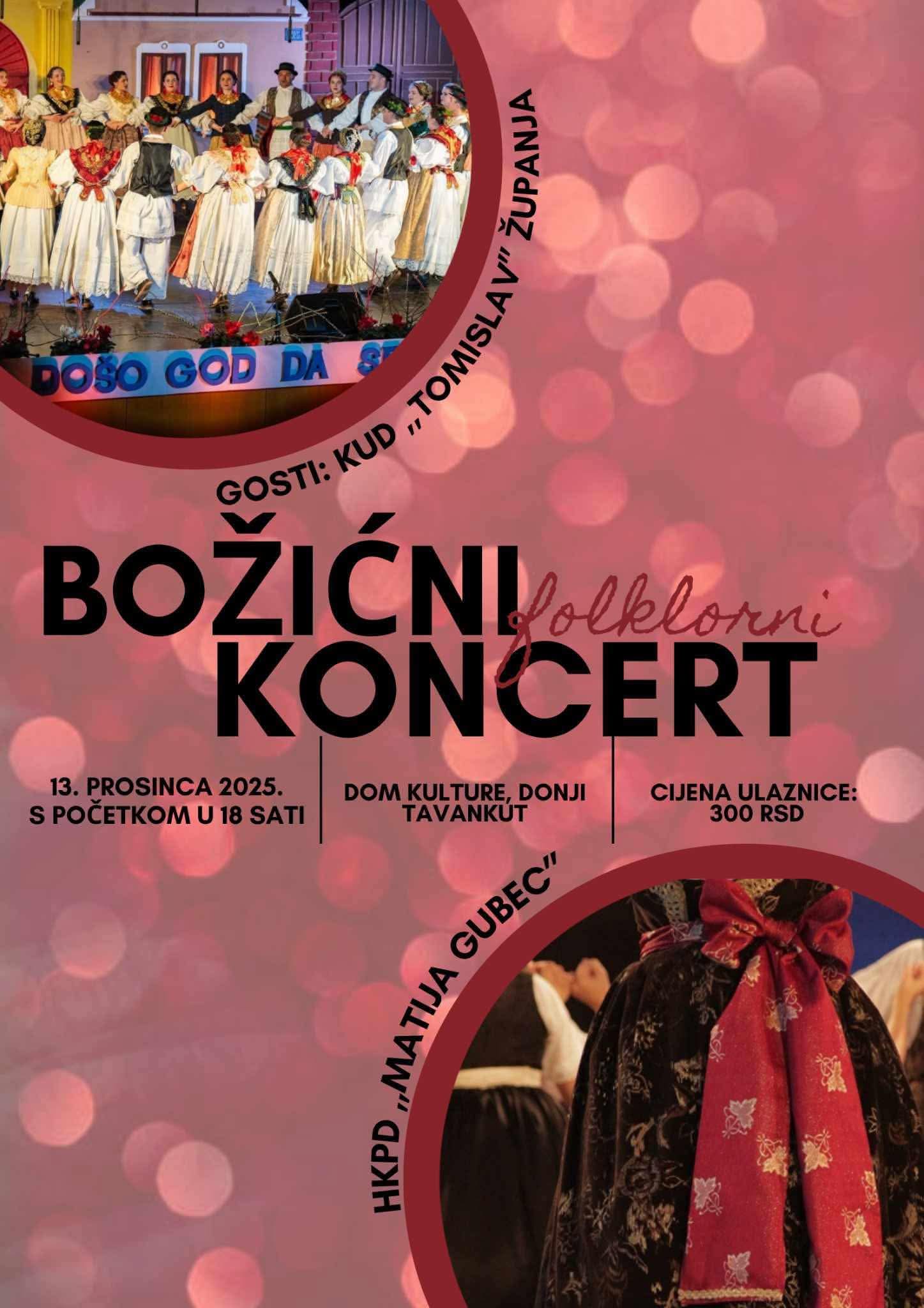 HKPD Matija Gubec iz Tavankuta priređuje Božićni koncert folklornog odjela u subotu, 13. prosinca 2025. godine u mjesnom Domu kulture s početkom u 18 sati. Gost koncerta je KUD Tomislav iz Županje. Iste će večeri svečano biti upaljena treća adventska svijeća.