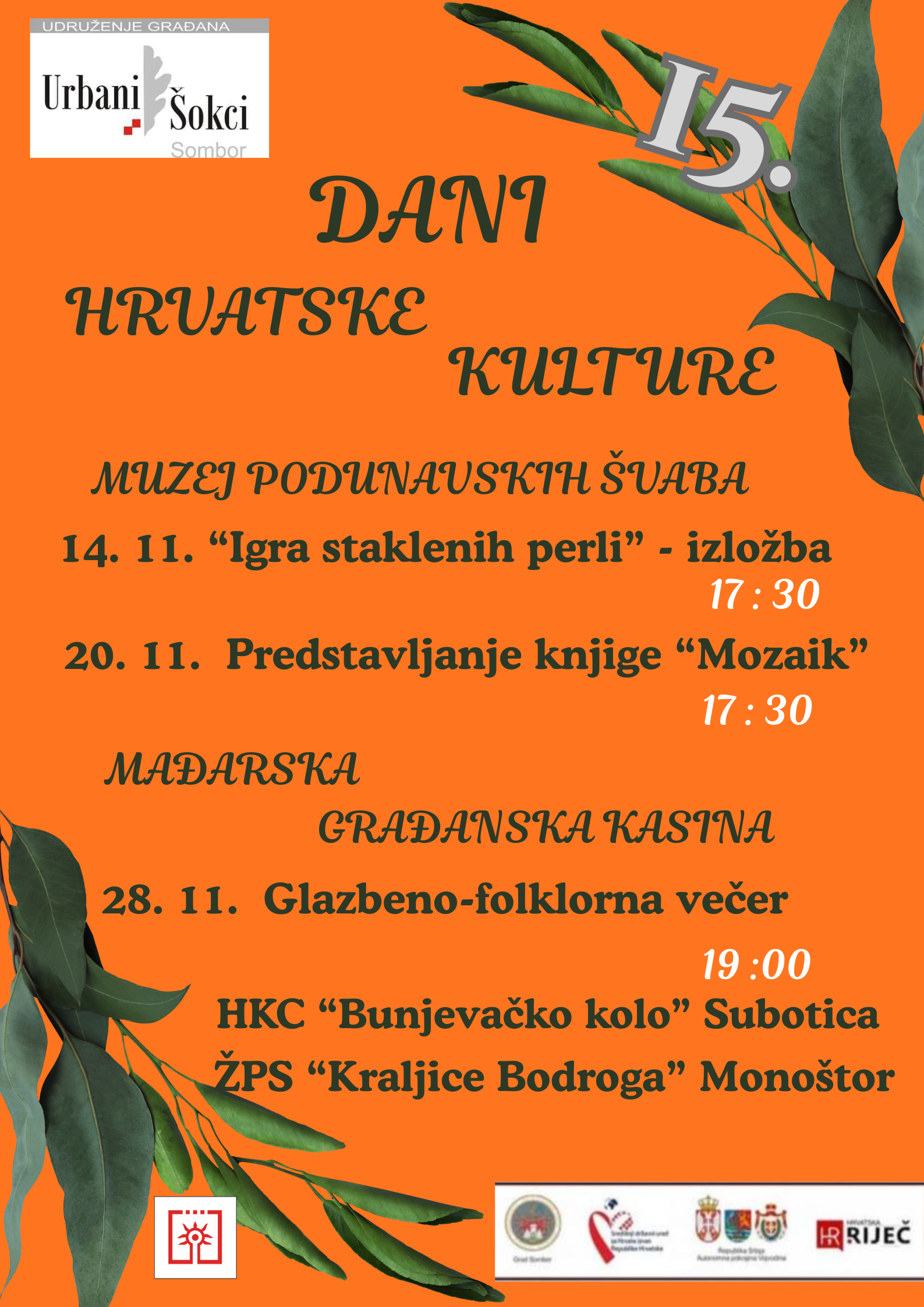 Udruga građana Urbani Šokci organizira 15. Dane hrvatske kulture koji će se održati 14. do 28. studenoga 2025. u Somboru.