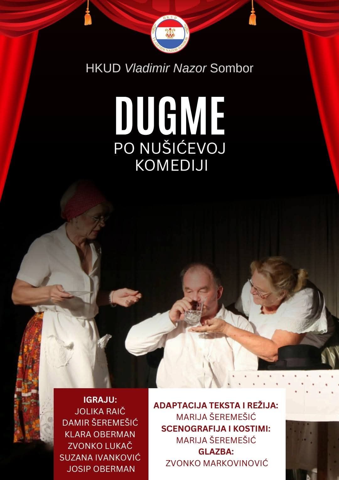Dramska sekcija HKUD-a Vladimir Nazor iz Sombora izvest će u petak, 20. veljače 2026. komediju Dugme u Domu kulture u Monoštoru.
